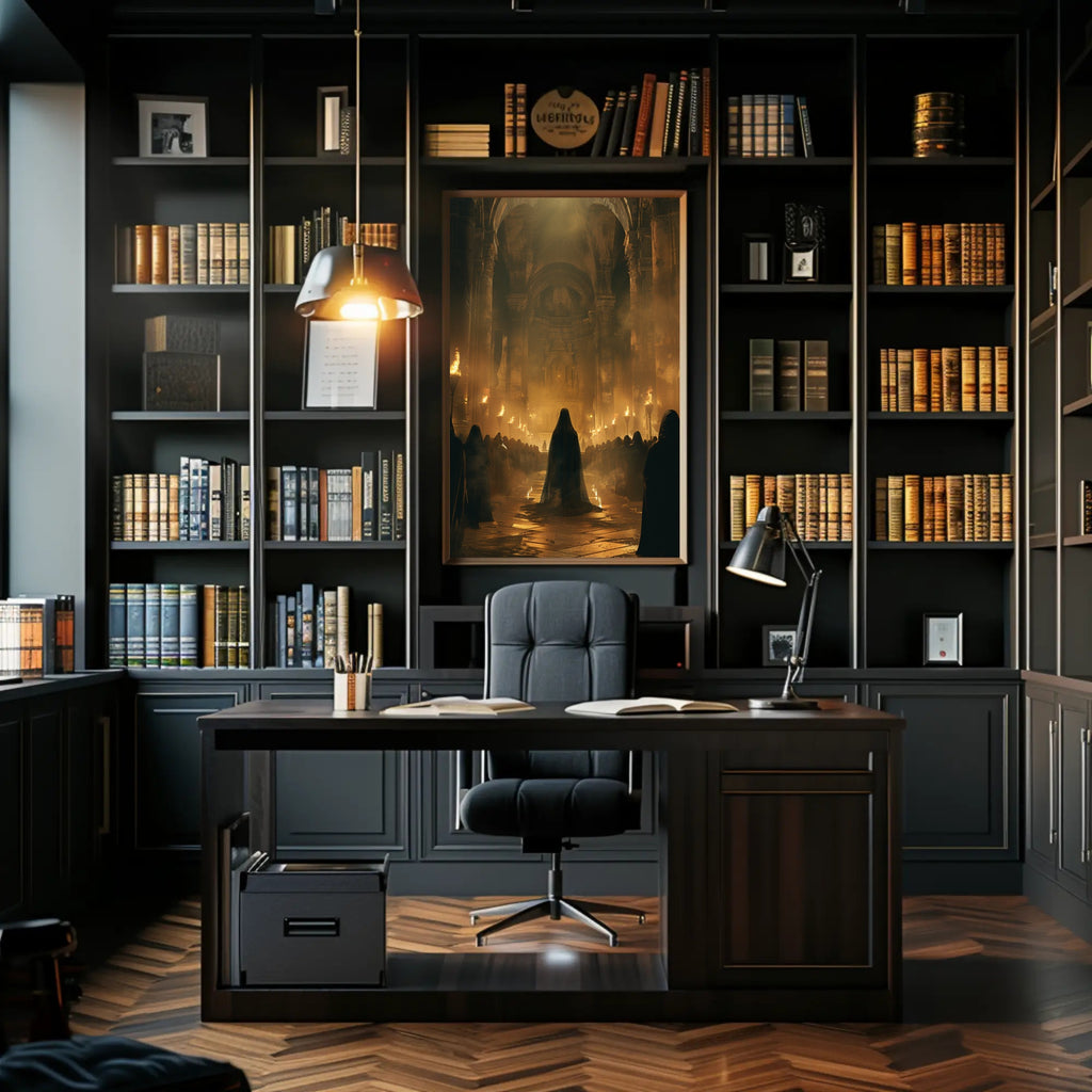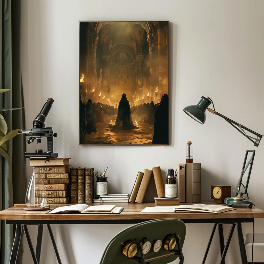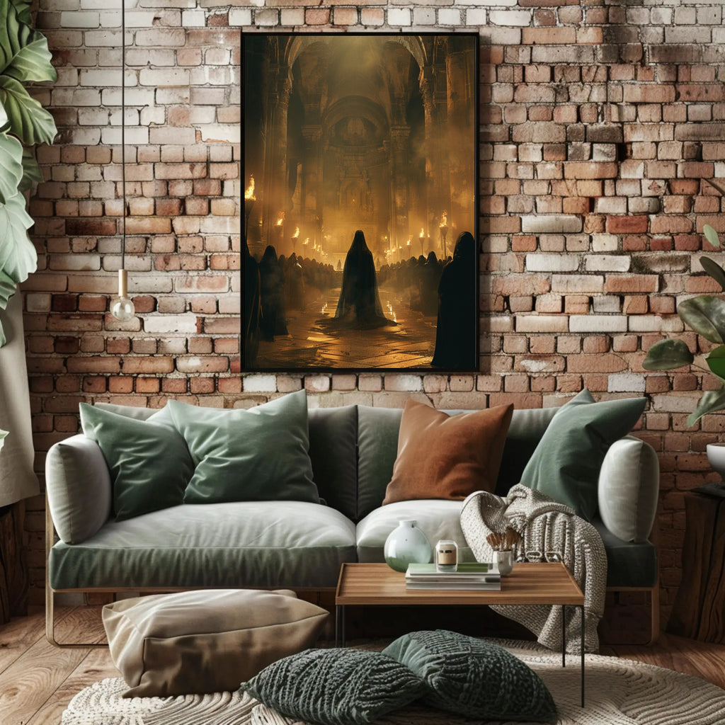 Mystical Gathering in Ancient Grand Hall Poster from PosterGoat captures a dark fantasy ritual in photorealistic detail — a solemn procession of hooded figures beneath soaring arches and torchlight that bathes an ancient hall in golden, smoky atmosphere. This cinematic poster brings suspenseful, mysterious ambiance to any room and is perfect for fantasy enthusiasts, collectors of eerie wall art, and lovers of grand architecture decor.