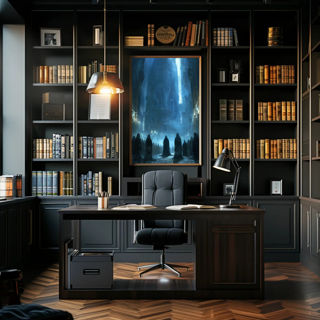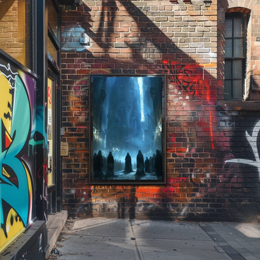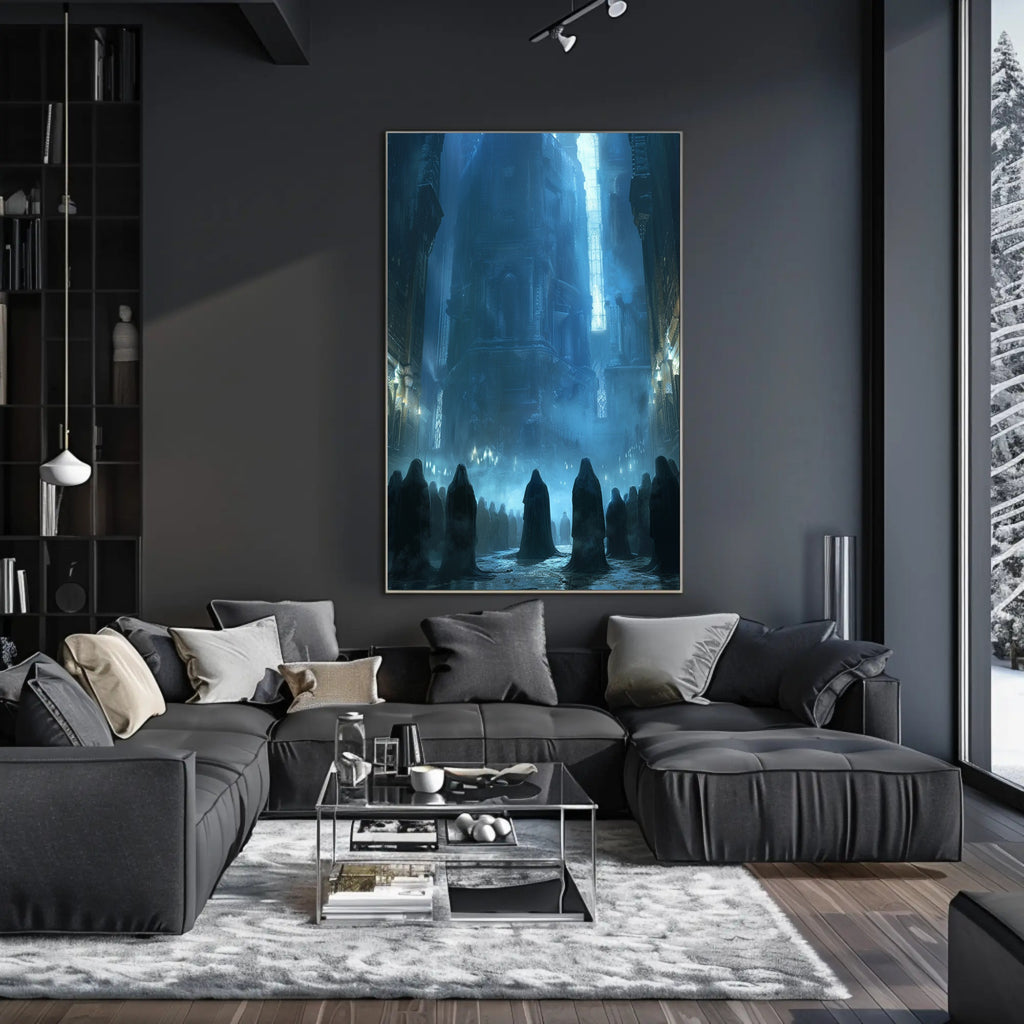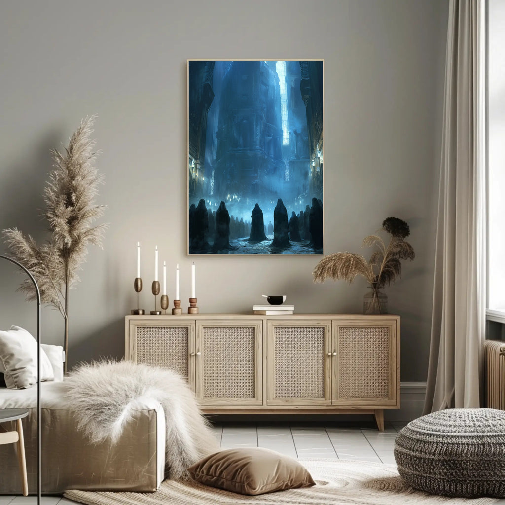 Immerse your space in a hauntingly beautiful scene with the Mystical Gothic Cathedral Dark Fantasy Poster from PosterGoat. This atmospheric decor piece captures a towering cathedral interior bathed in ethereal blue light, where hooded figures gather in the fog—an evocative blend of gothic architecture and dark fantasy that transforms any wall into a cinematic focal point.