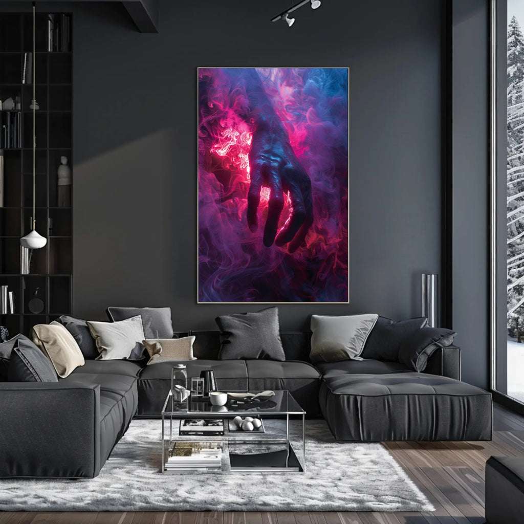 Bring an otherworldly focal point to your home with the Mystical Hand in Smoke Poster from PosterGoat — a striking decorative print that fuses ethereal smoke, neon color, and minimalist composition into a mesmerizing piece of wall art.