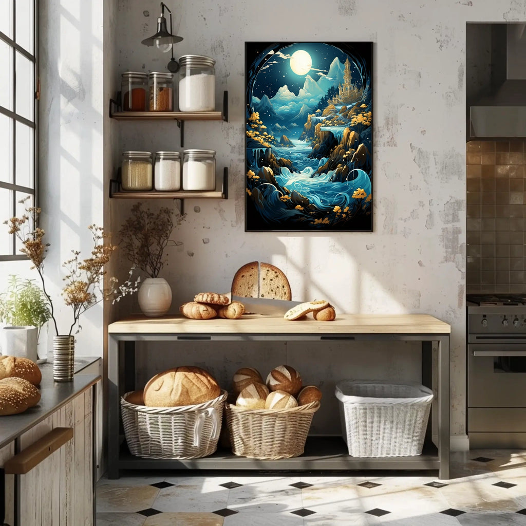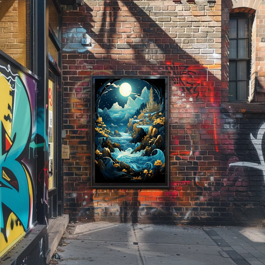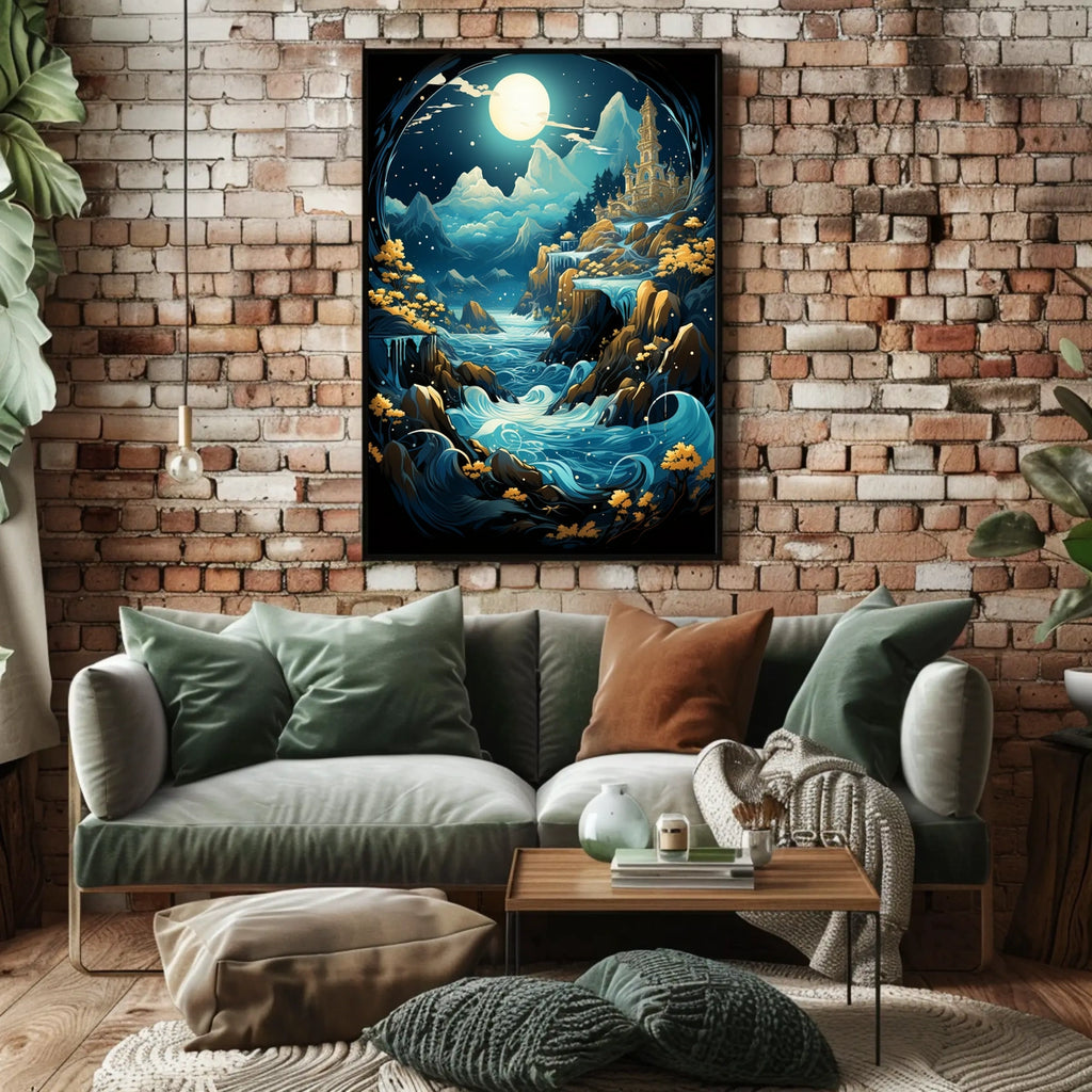Transform your space with this enchanting fantasy art poster, featuring a mystical landscape where imagination meets serenity. The scene captures a golden domed structure perched on a cliffside, surrounded by majestic mountains under the ethereal glow of a full moon. Cascading waterfalls and a tranquil river weave through the rocky terrain, while golden foliage adds warmth to the cool, blue-toned scenery. This intricate illustration blends fantasy and surrealism, creating a magical atmosphere that invites exploration and tranquility. Perfect for those who appreciate architectural marvels and the harmonious beauty of nature.