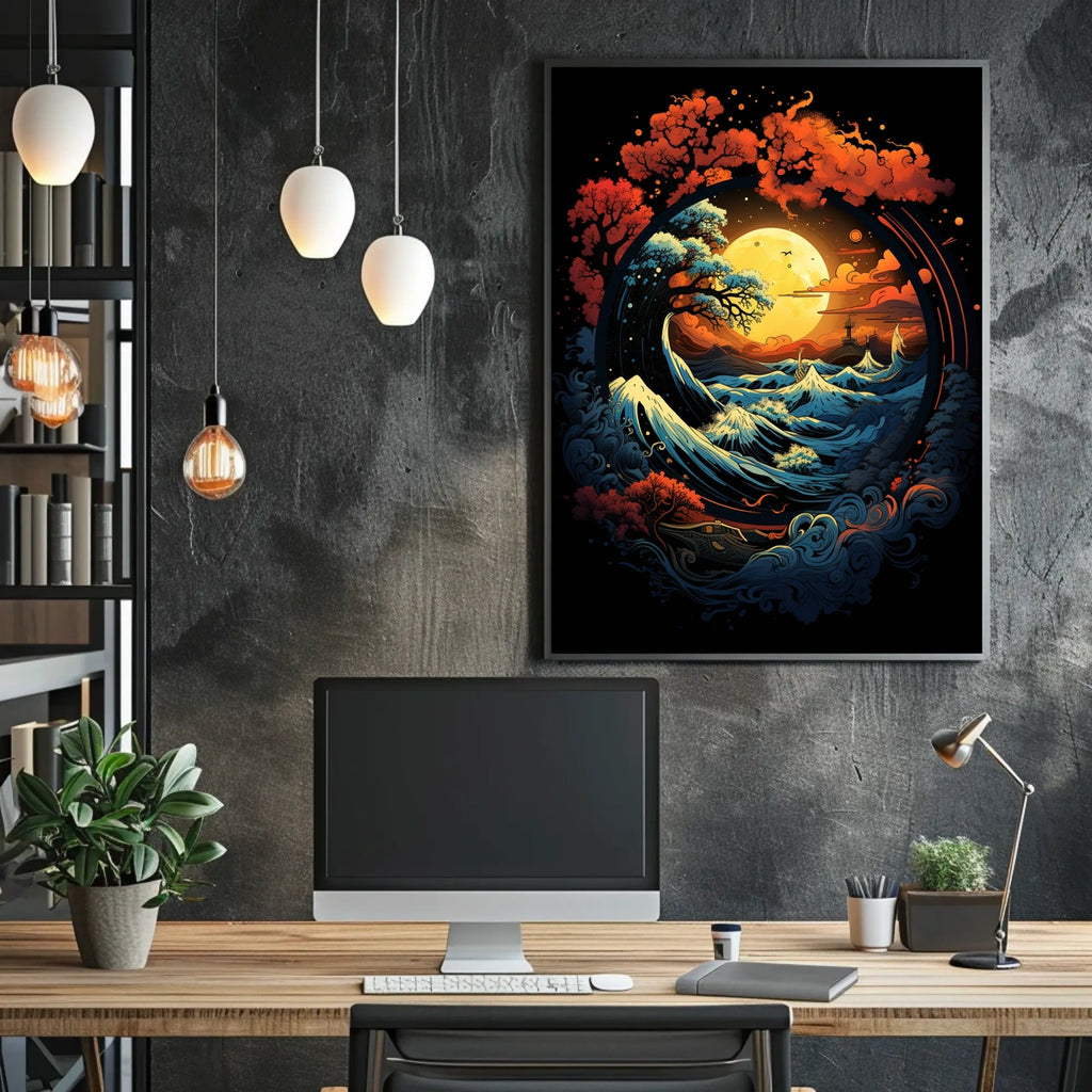 Immerse yourself in a captivating fusion of nature and cosmos. Dominated by a luminous full moon, the scene unfolds with mountainous waves and vibrant trees, evoking earthly and celestial wonder. The intricate design draws inspiration from traditional East Asian art, featuring stylized waves and a distant pagoda-like structure, all rendered in bold, contrasting colors. This surreal artwork creates a dynamic visual experience, inviting viewers to explore themes of balance and beauty. Perfect for those seeking tranquility and inspiration, this piece harmonizes the mystical elements of nature and the universe.