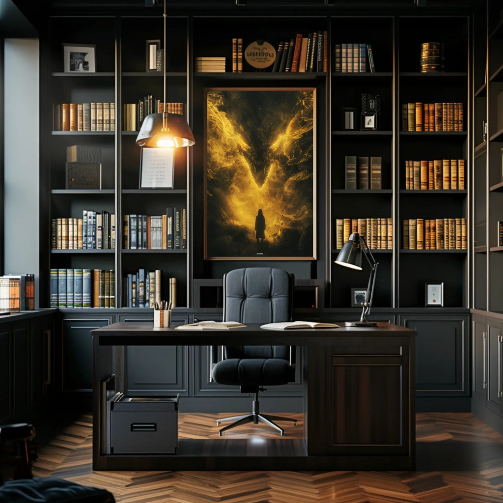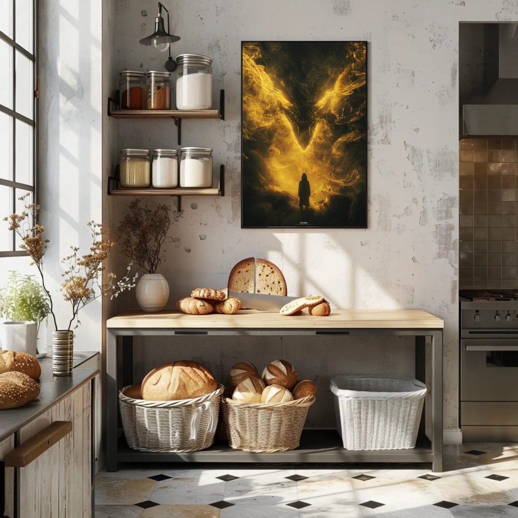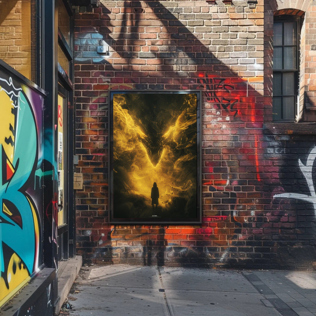 This poster blends cinematic composition with textured, painterly smoke and light effects to create an enigmatic mood that complements minimalist and eclectic decor alike. The high-contrast golden highlights pop against deep shadows, making it an ideal piece to anchor a gallery wall or become a standalone statement poster in the Posters category of Home & Garden decor.