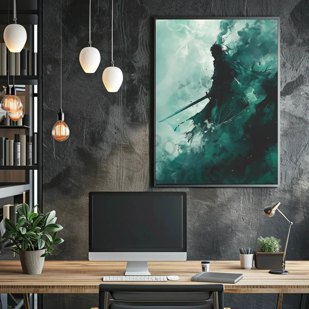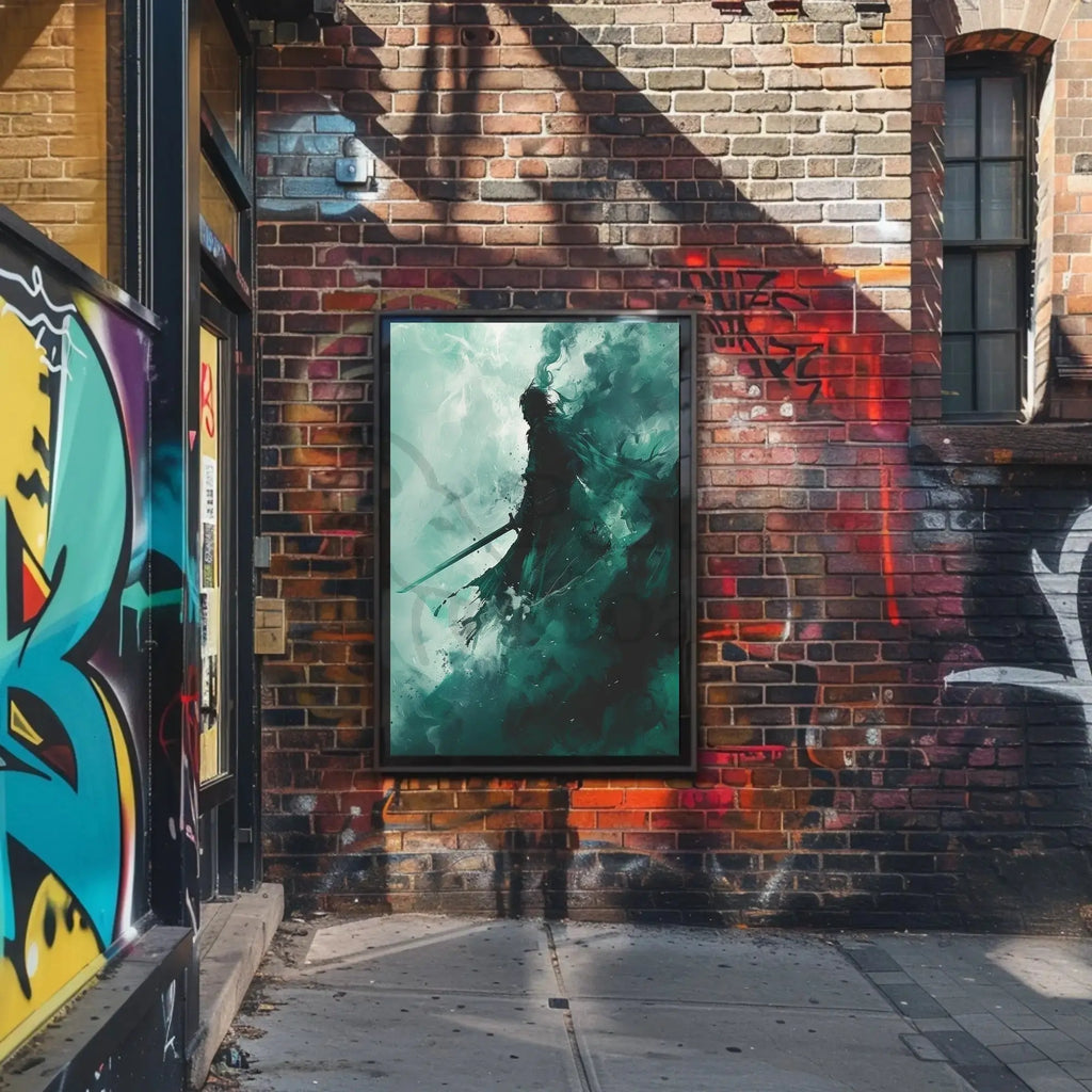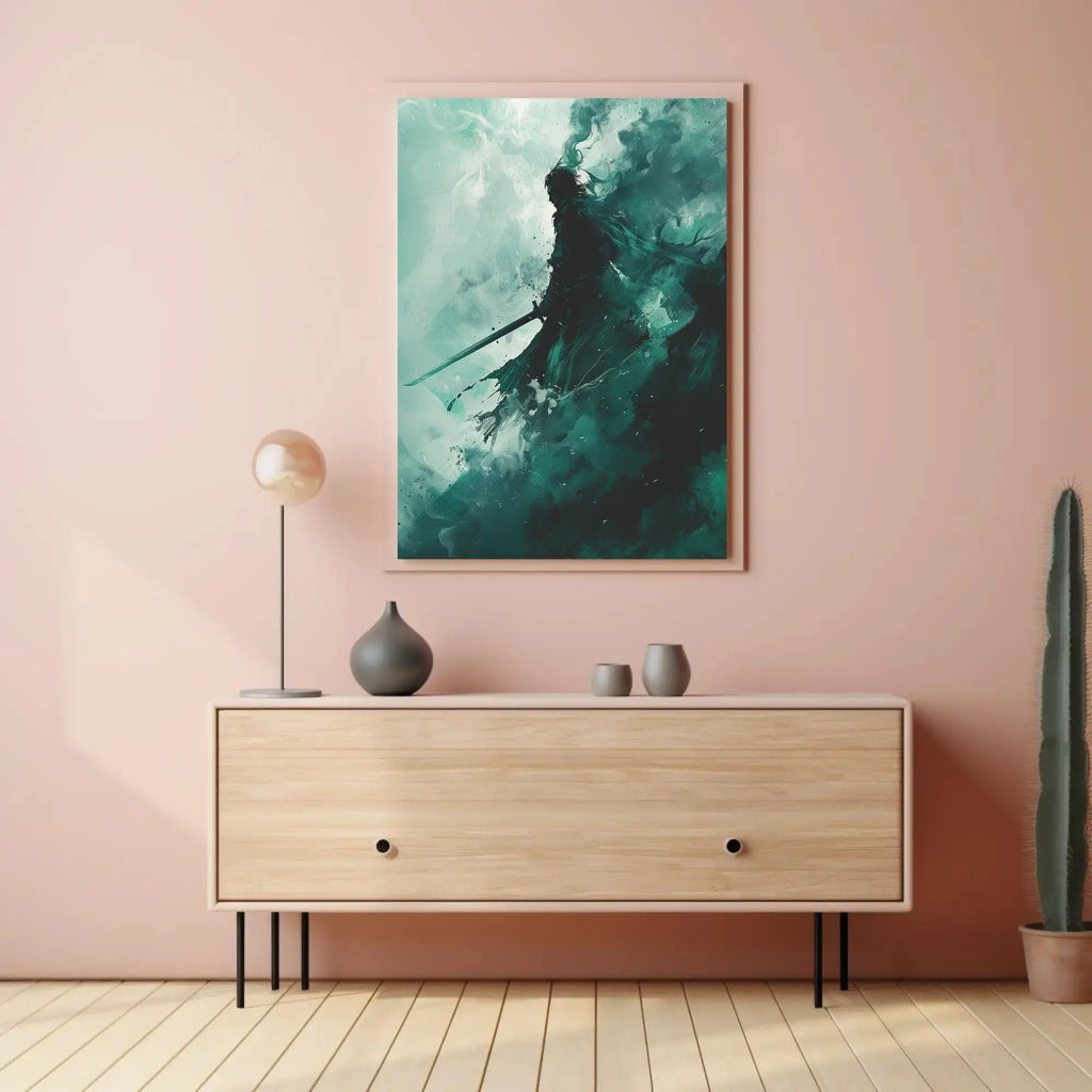 This poster features a lone, sword‑wielding figure emerging from swirling teal smoke and ethereal mist. The dynamic, almost cinematic movement of paint and shadow creates an enigmatic, supernatural mood that works equally well as fantasy decor or contemporary wall art.