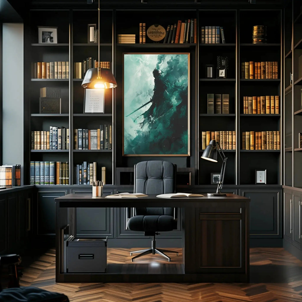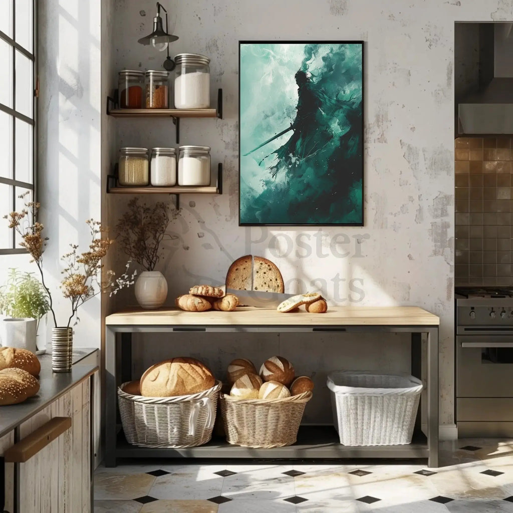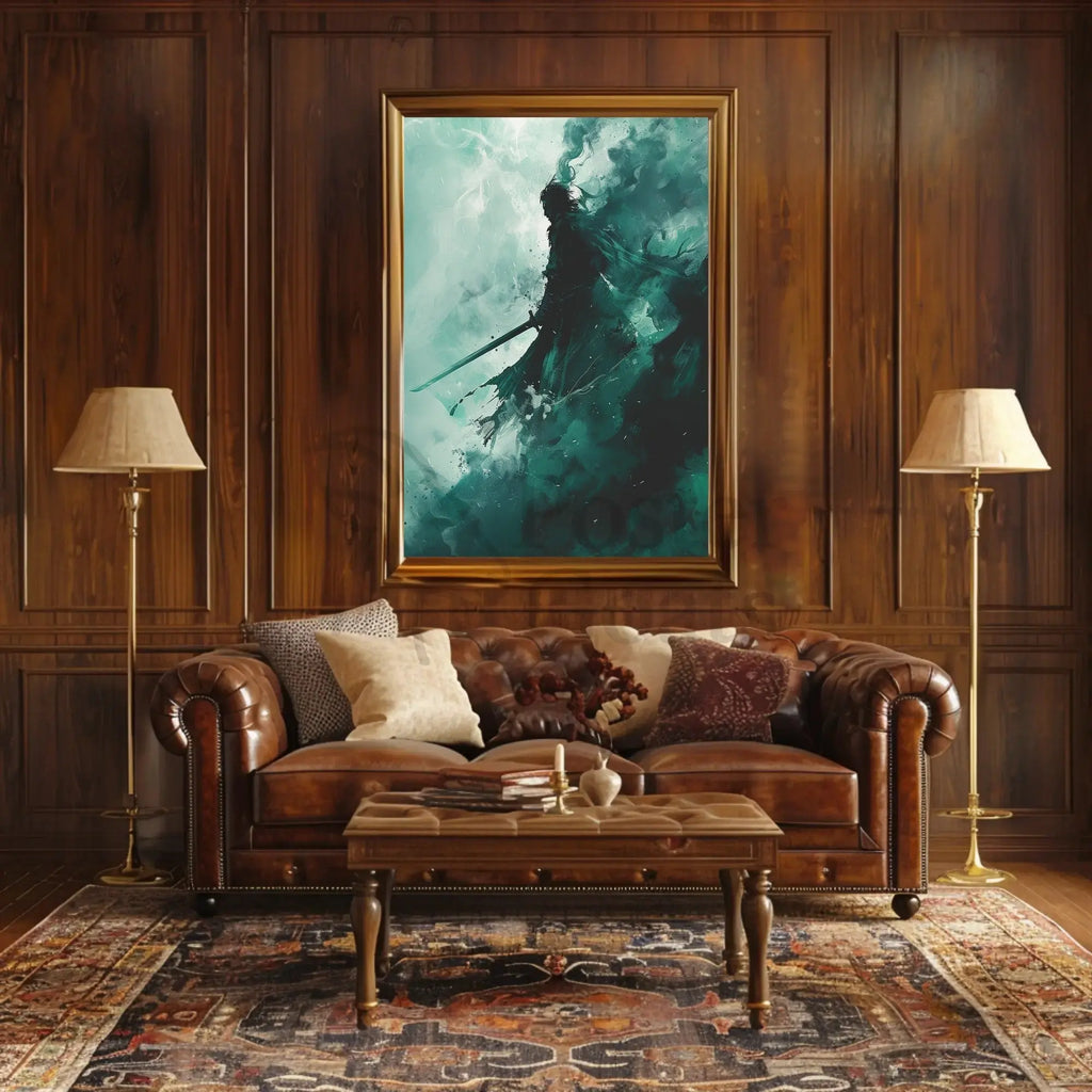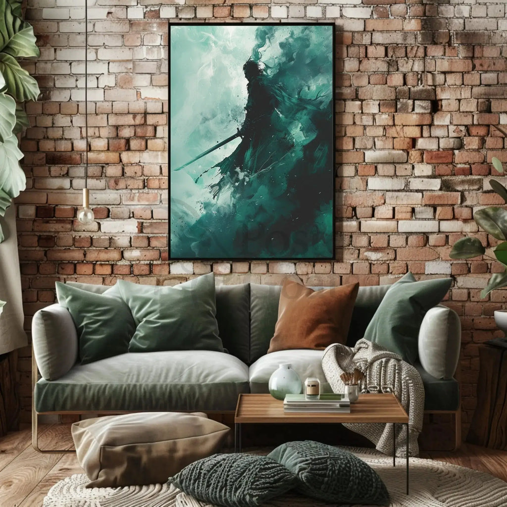 This poster features a lone, sword‑wielding figure emerging from swirling teal smoke and ethereal mist. The dynamic, almost cinematic movement of paint and shadow creates an enigmatic, supernatural mood that works equally well as fantasy decor or contemporary wall art.