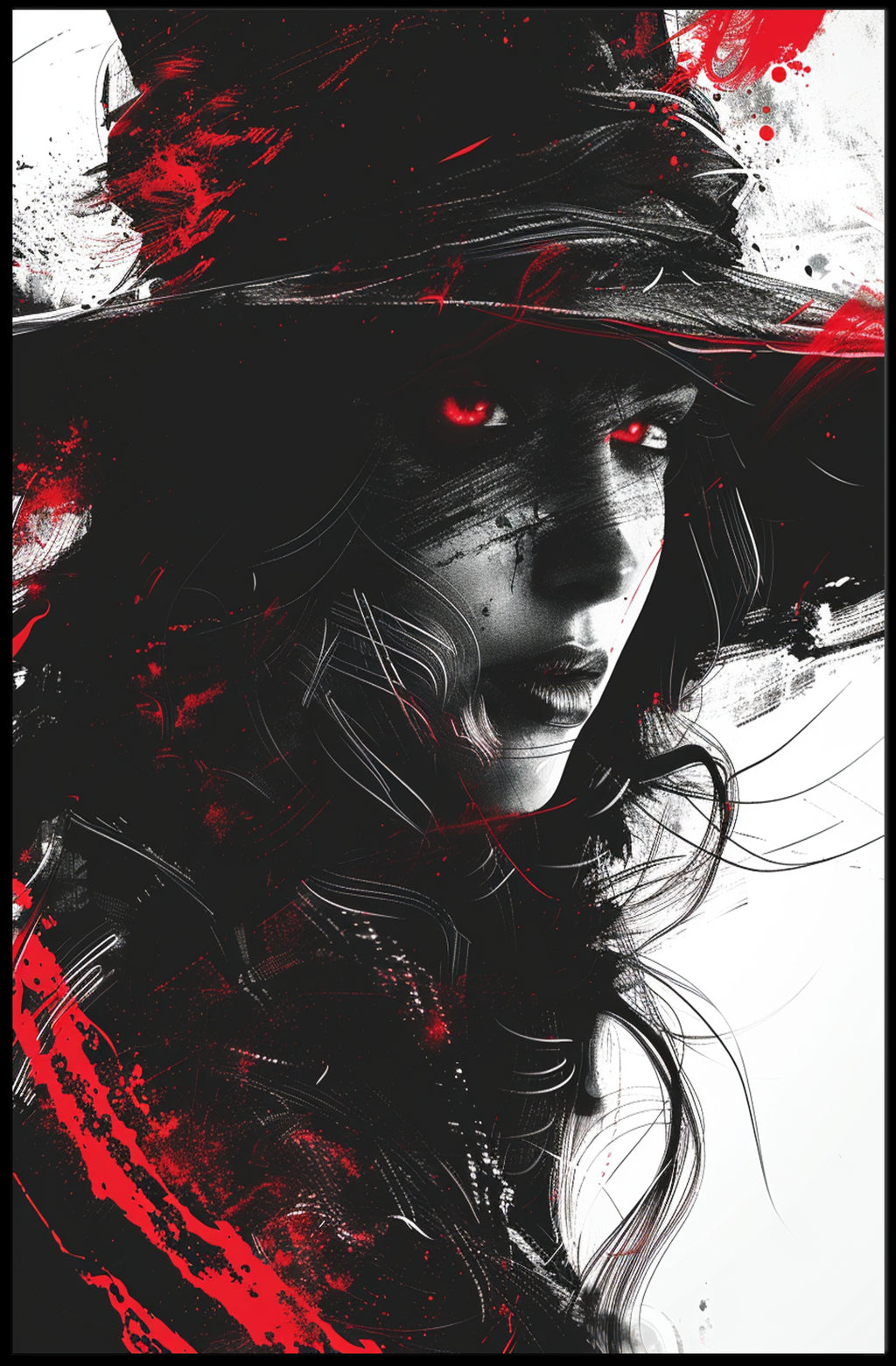 Bring fantasy and refined edge to your walls with the "Mystical White Fox in Winter Wonderland Poster" from PosterGoat — a dramatic, high-impact piece that blends East Asian-inspired fantasy with modern pop-art sensibility. This poster captures a hauntingly beautiful spirit: a noir portrait rendered in deep blacks and crisp whites, punctuated by vivid red brushstrokes and glowing red eyes that draw the viewer into a surreal winter landscape.