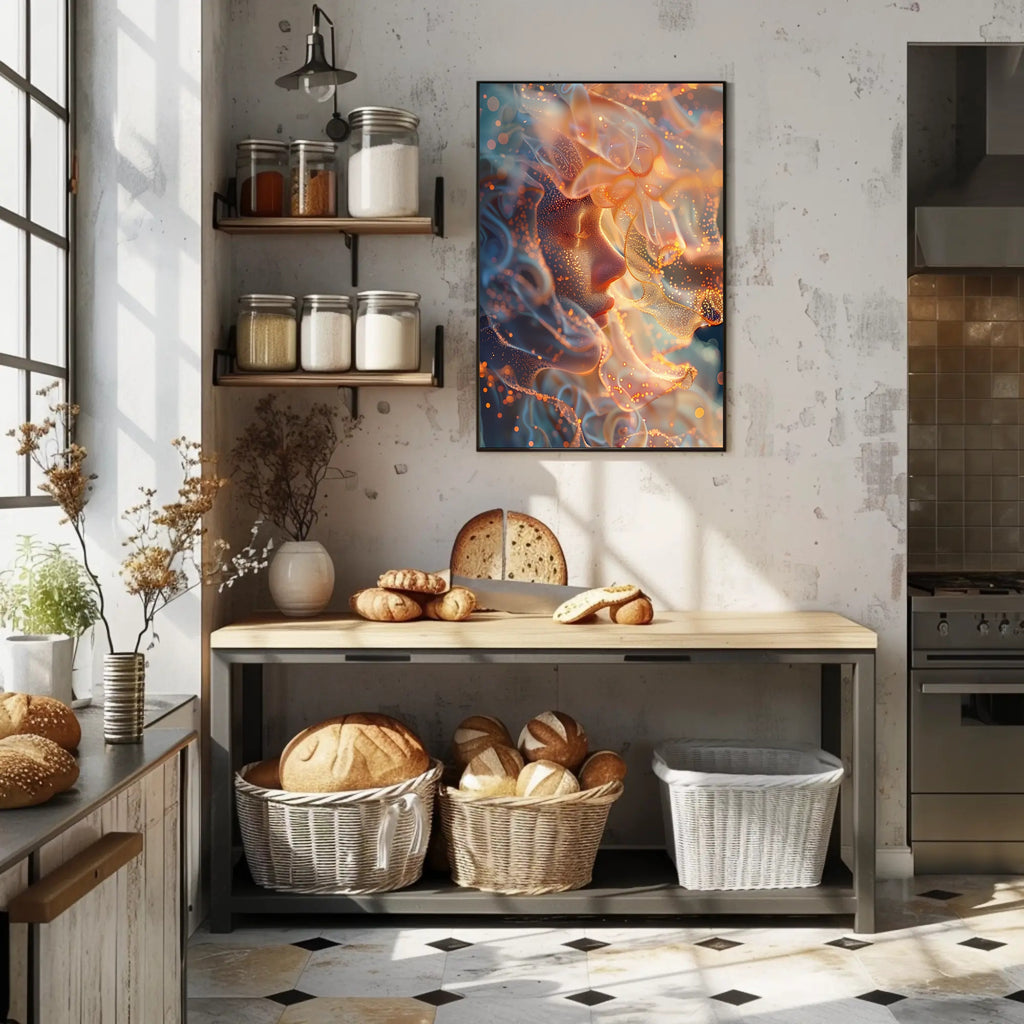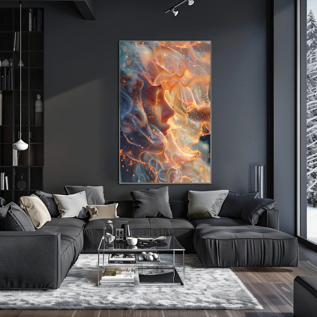 Rich, cinematic color palette: Warm golds and ambers contrast with cool blues to produce depth and luminous highlights that catch the eye from across the room.