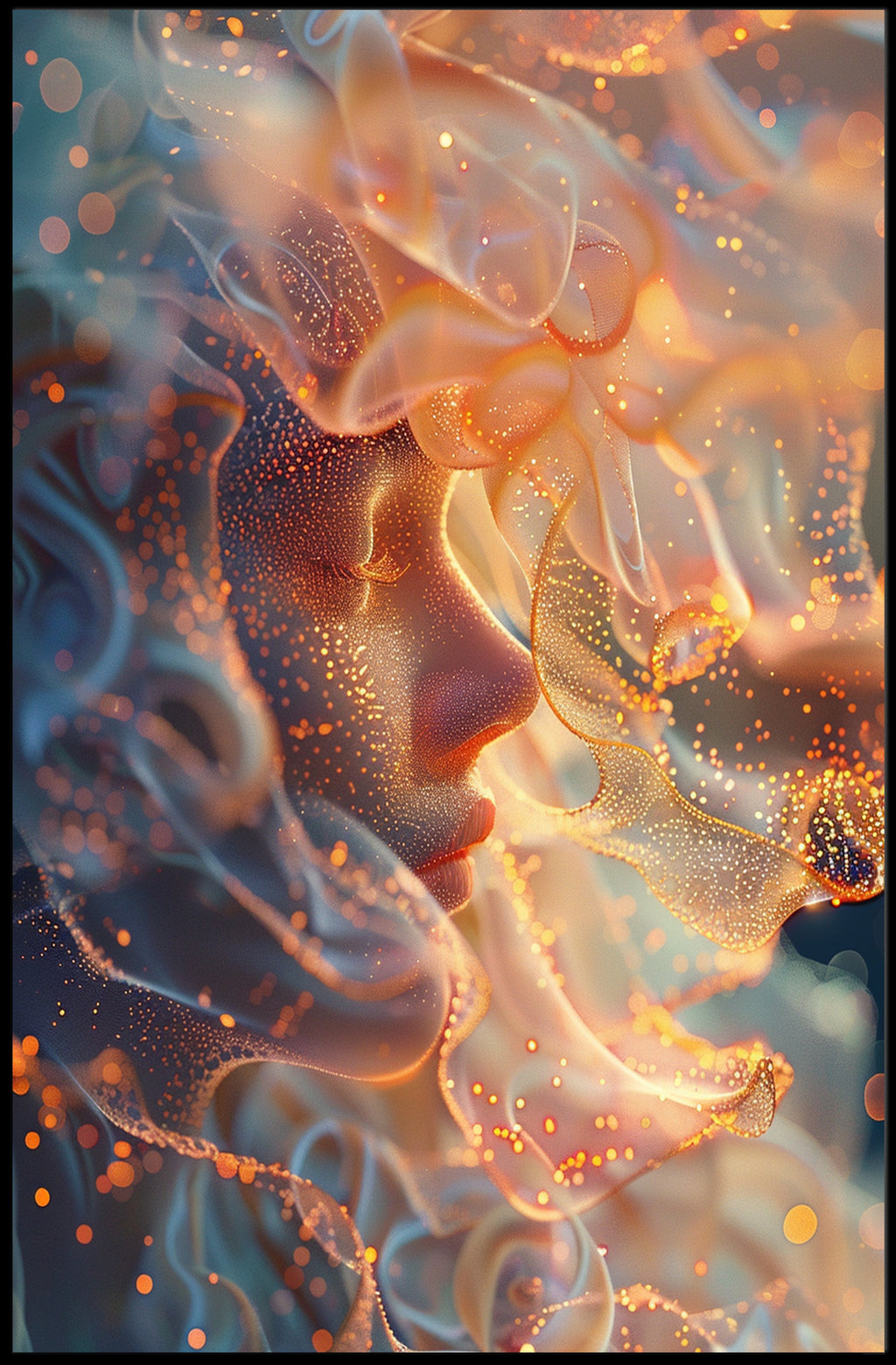Fantasy realism & texture: Fine dot-led textures and sparkling particles add tactile realism and magical energy, making the piece feel alive and atmospheric.