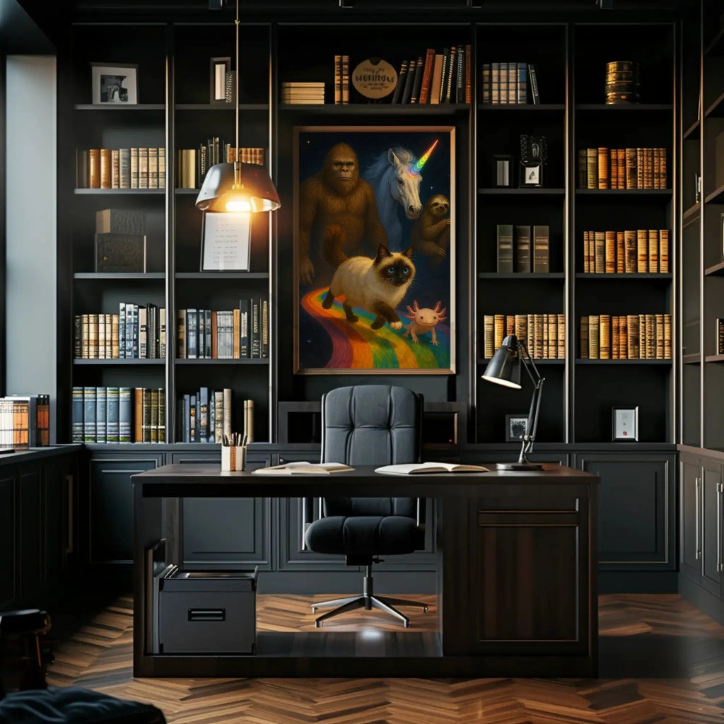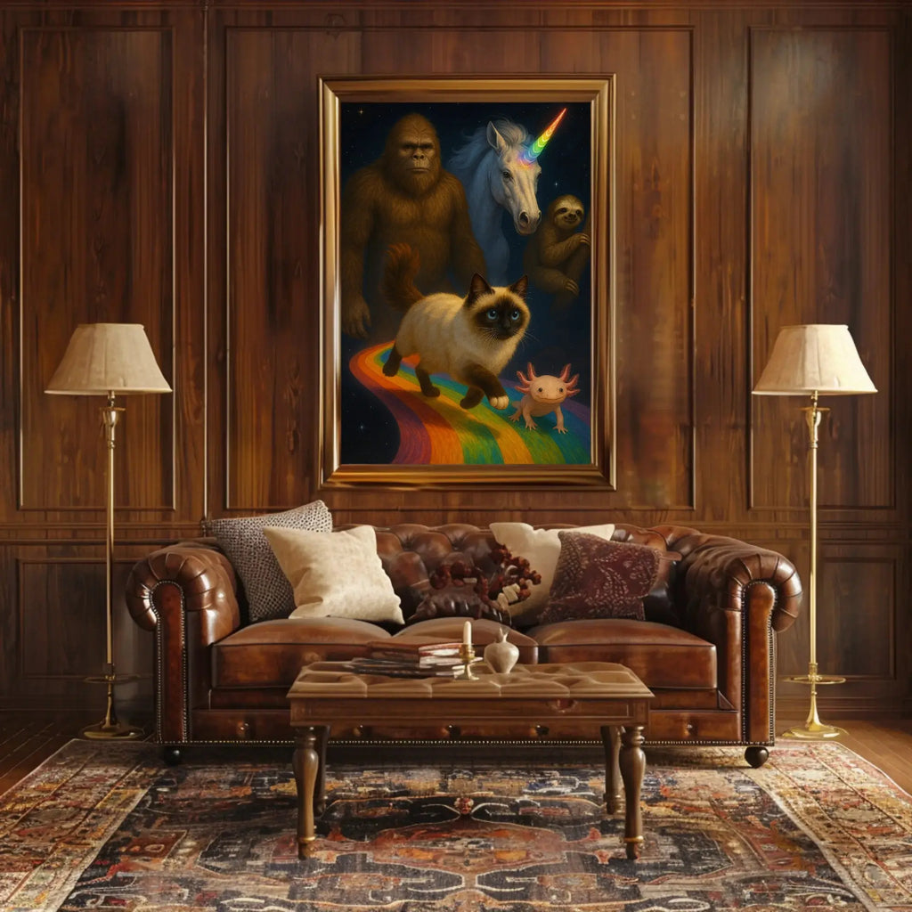 Step into a dreamlike universe with the Mythical Creatures on Cosmic Pathway Animal Poster from PosterGoat — a striking piece of fantasy wall art that blends surrealism, vibrant colors, and whimsical charm. This poster features a regal Himalayan cat confidently striding along a glowing rainbow pathway, accompanied by a majestic unicorn with a prismatic horn, an enigmatic Bigfoot, a contented sloth, and an amiable axolotl — a playful composition that invites imagination into any space.