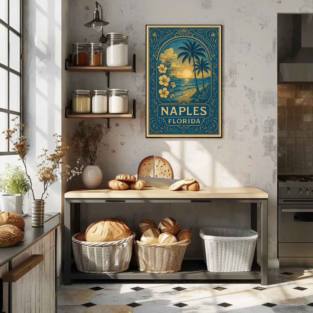 - Detailed design capturing the coastal Naples landscape and vintage travel poster aesthetic