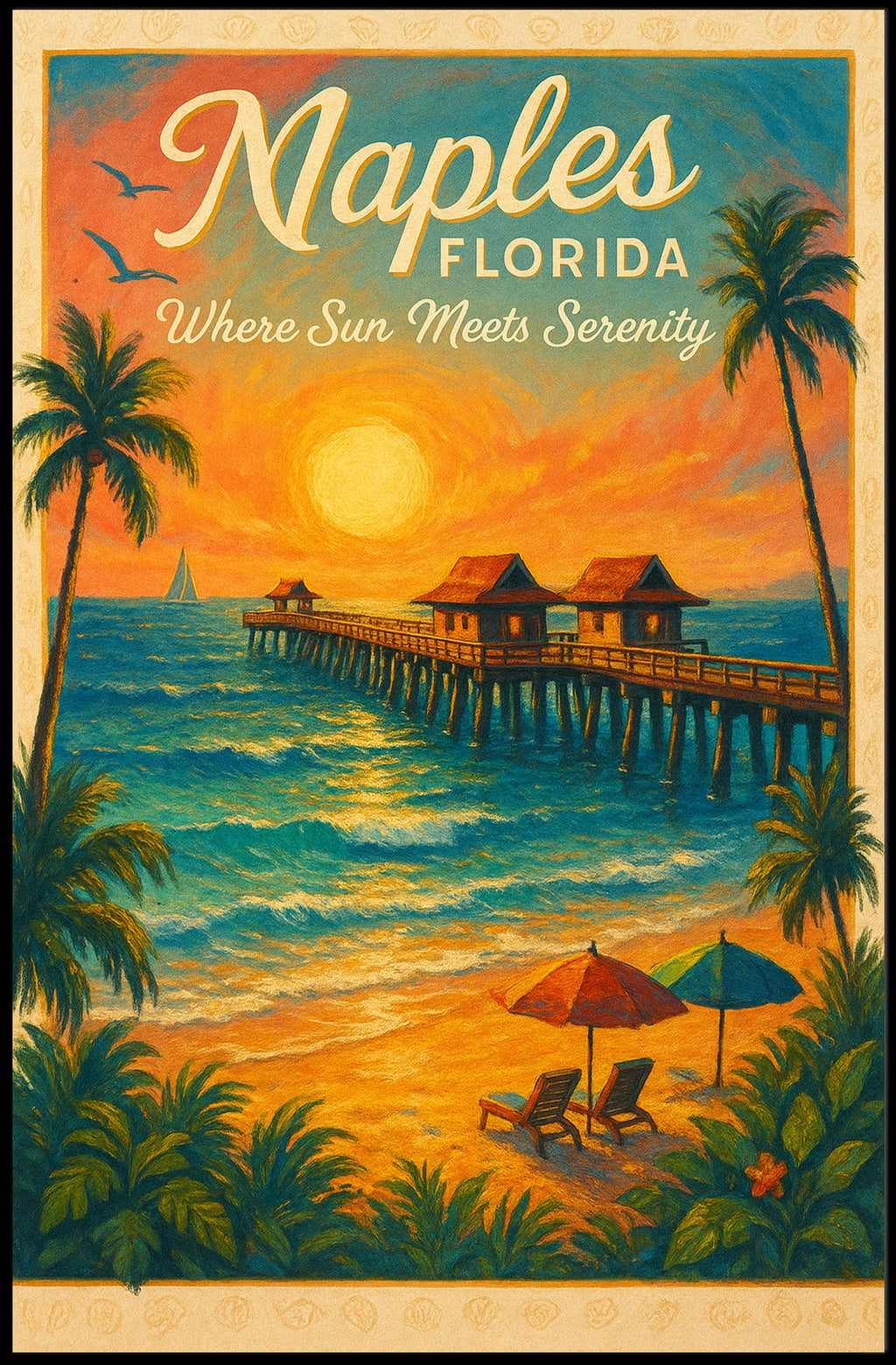 Capture the laid-back charm of Naples, Florida with this Where Sun Meets Serenity poster. Designed for decor lovers and wanderlust spirits, it brings sun-kissed scenery inside your home. The artwork blends a touch of Impressionism with Photography Realism to echo real-world views, turning any wall into a mini escape. Perfect for living rooms, bedrooms, hallways, or a cozy workspace—it pairs with bright neutrals or coastal blues for instant mood-boosting style. A great fit for Home & Garden decor and posters collections.
