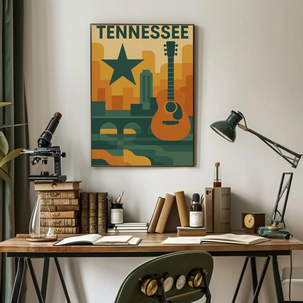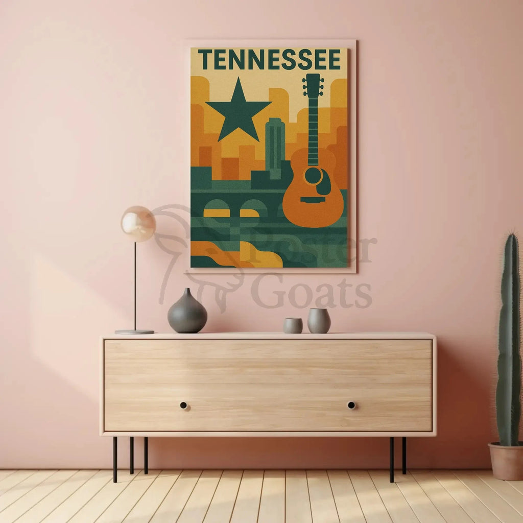 Immerse yourself in the vibrant spirit of Nashville with this captivating poster that captures the essence of Tennessee's iconic music scene. Featuring a stylized cityscape and an oversized guitar, this artwork celebrates the cultural heartbeat of "Music City." The geometric design, with its bold shapes and crisp lines, is brought to life by a warm, earthy color palette of orange, green, and yellow, evoking a vintage allure. Whether you're a music lover or an art enthusiast, this poster is a perfect tribute to Nashville's rich urban and musical heritage.