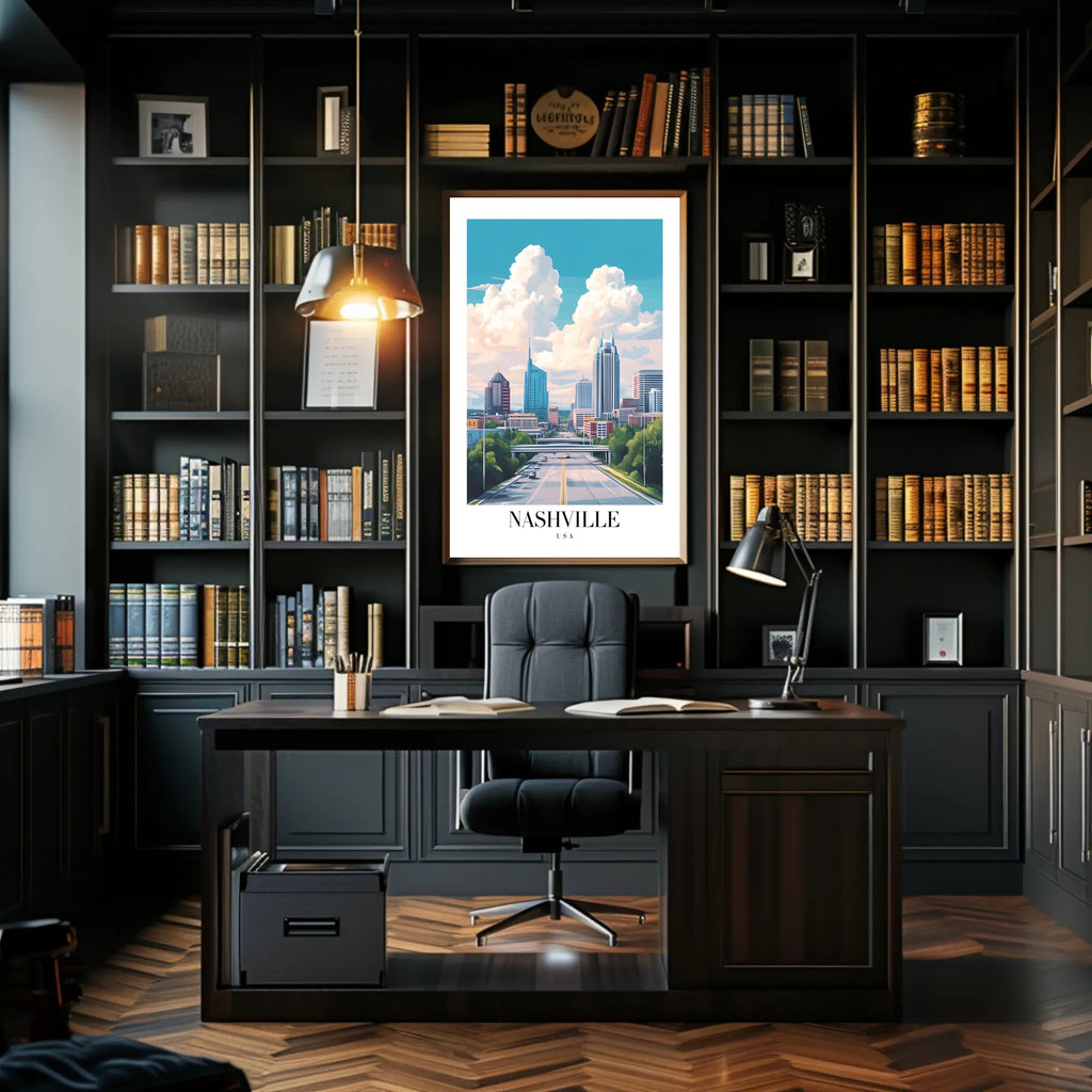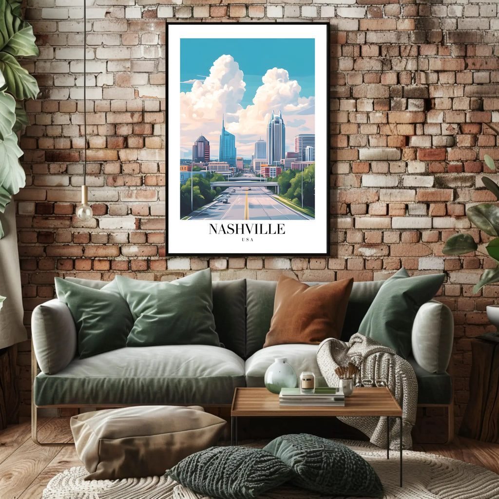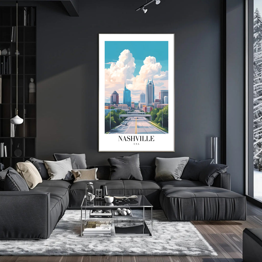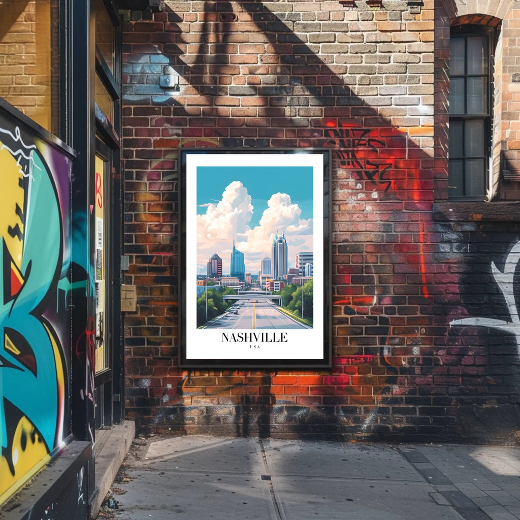 This captivating poster beautifully captures the energetic essence of Nashville's iconic skyline. The illustration showcases the dynamic urban landscape with modern skyscrapers set against a tranquil partly cloudy sky. The road leading into the city, flanked by lush greenery, symbolizes the harmonious blend of urban sophistication and natural beauty. With its vivid color palette and modern, stylized design, this artwork injects life and vibrancy into any space. Perfect for those who admire urban charm or have a special connection to Nashville, this poster is more than just wall art—it's a statement piece.