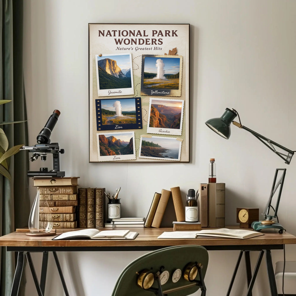 - Striking visual design: A curated collage of high-resolution park photography framed like retro Polaroids and film strips — perfect for entryways, living rooms, bedrooms, or office walls.