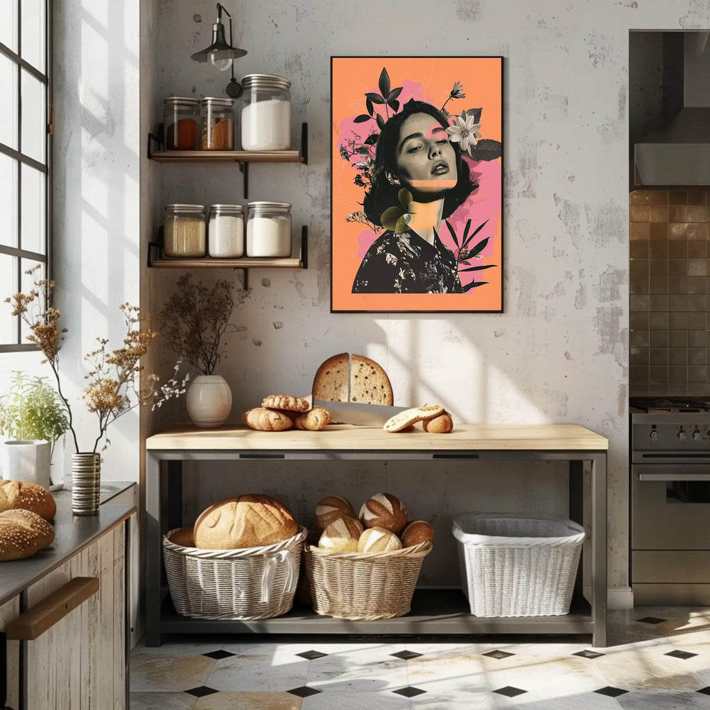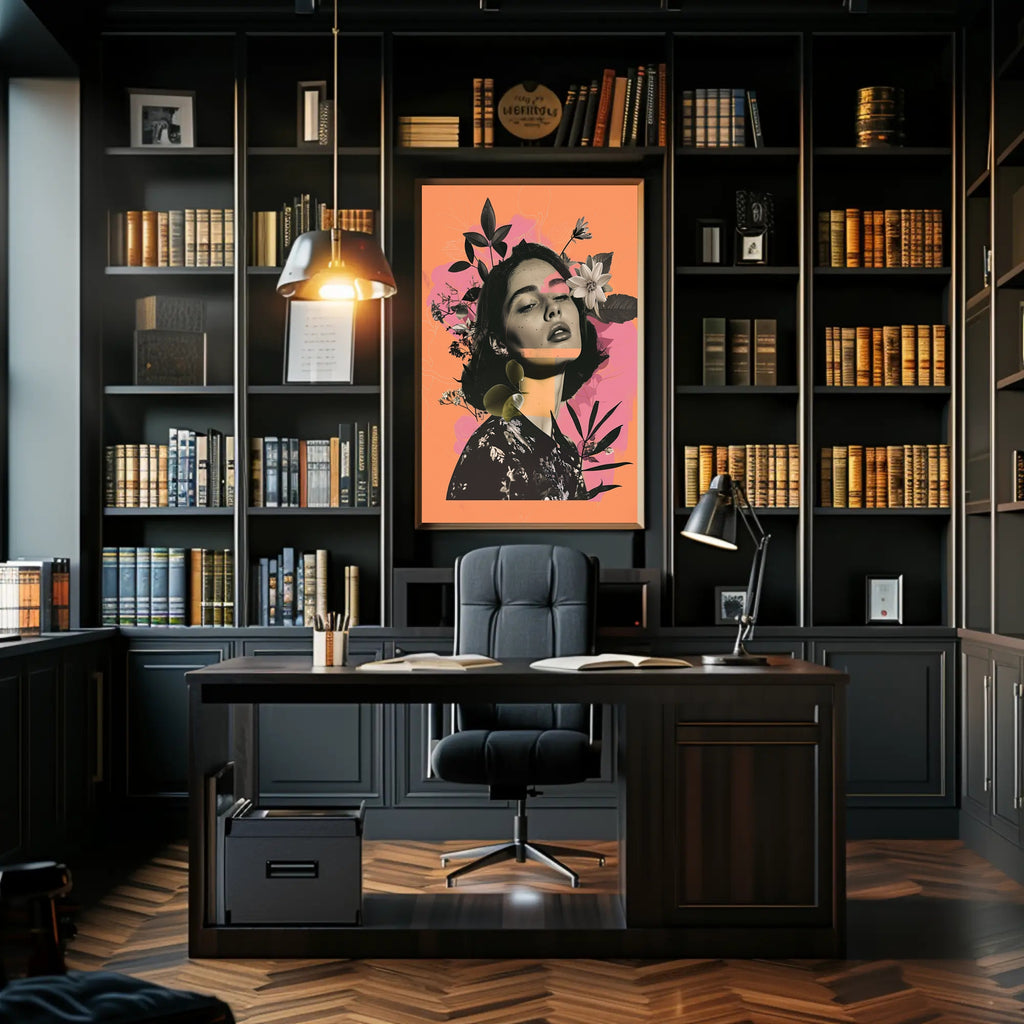 This captivating poster features a woman artistically intertwined with a botanical setting, where floral elements and leaves seamlessly blend into her hair and surroundings. The centerpiece of the design, a prominent flower near her forehead, beautifully accentuates the harmonious fusion of human and nature. The artwork masterfully combines photorealism with modern abstract styles, creating an intriguing visual experience. Imbued with a sense of tranquility and connection to the natural environment, this piece is perfect for those who appreciate the subtle intersection of artistry and nature, making it an exquisite addition to any contemporary art collection.