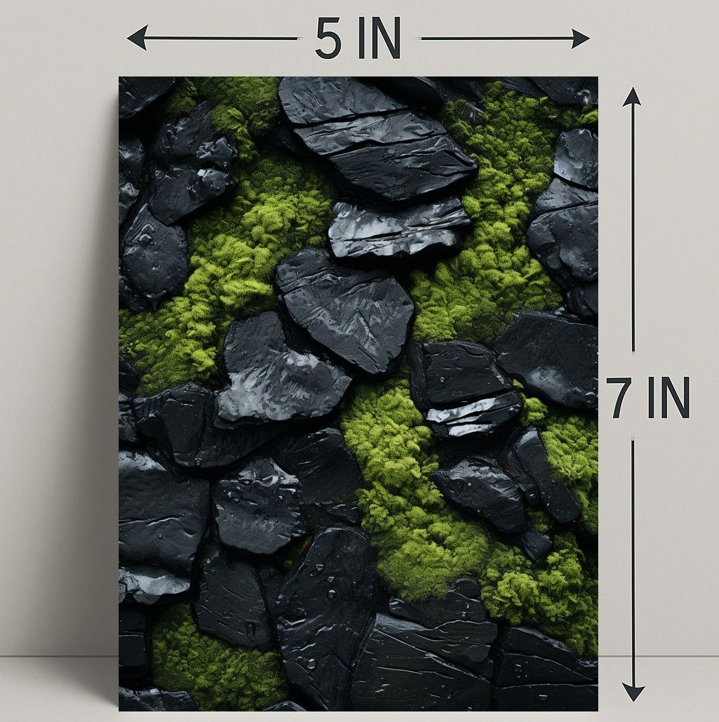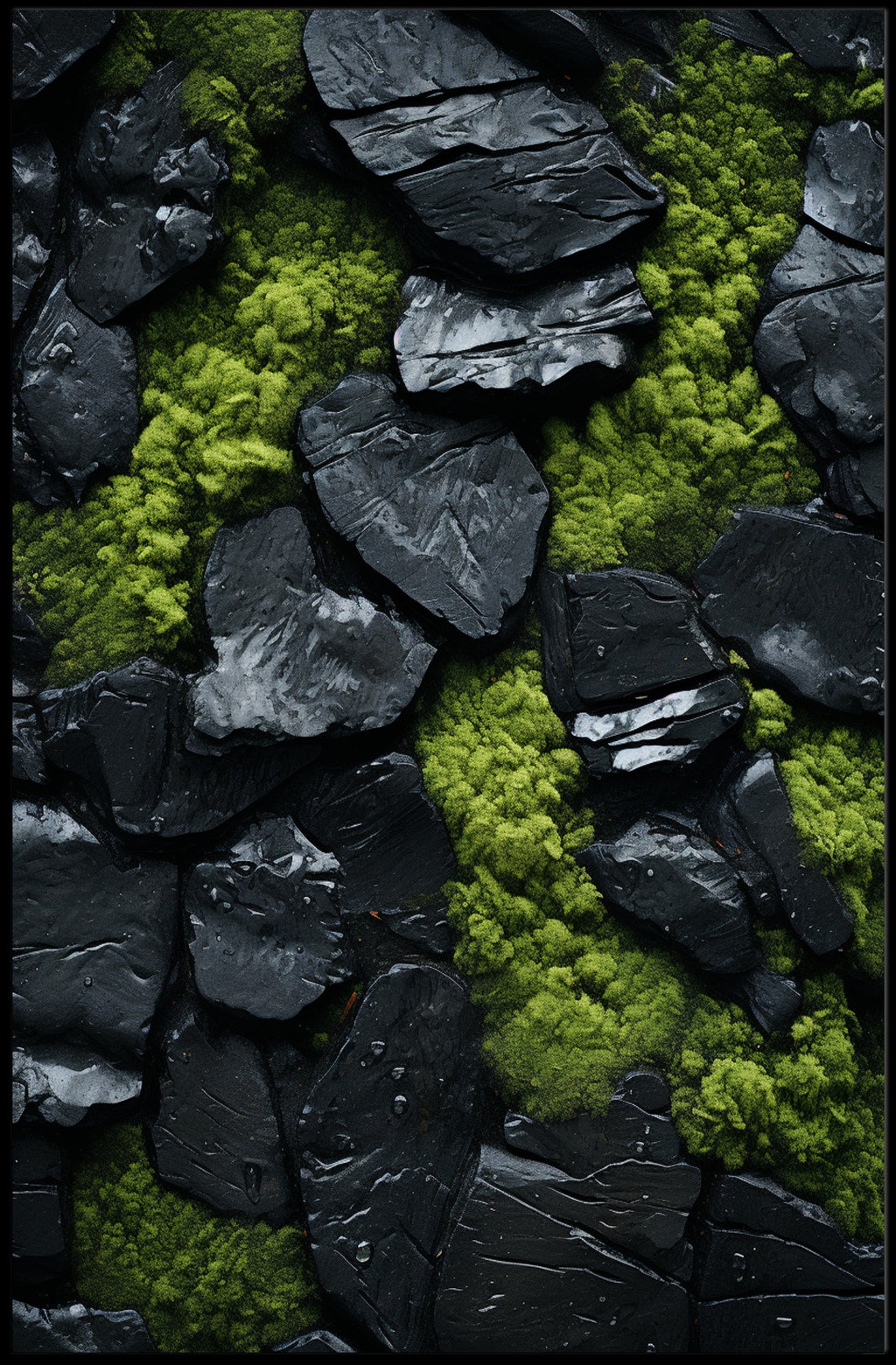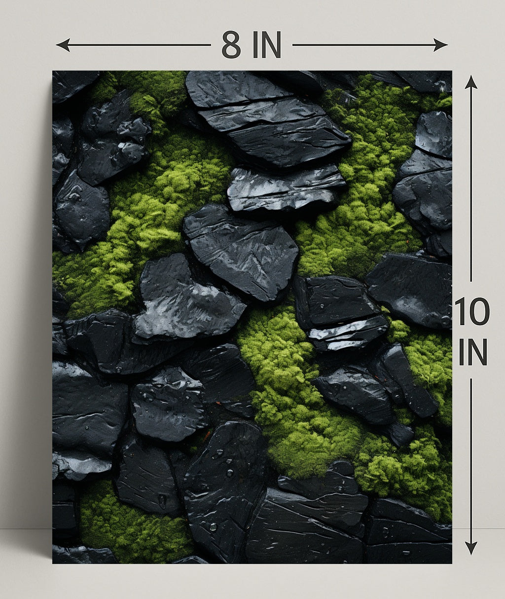 This minimalist poster celebrates natural textures and dramatic contrast: the glossy, rain-kissed slate surfaces and plush, cushion-like moss are rendered in ultra-clear detail to bring depth and serenity to modern interiors, offices, or gallery walls.