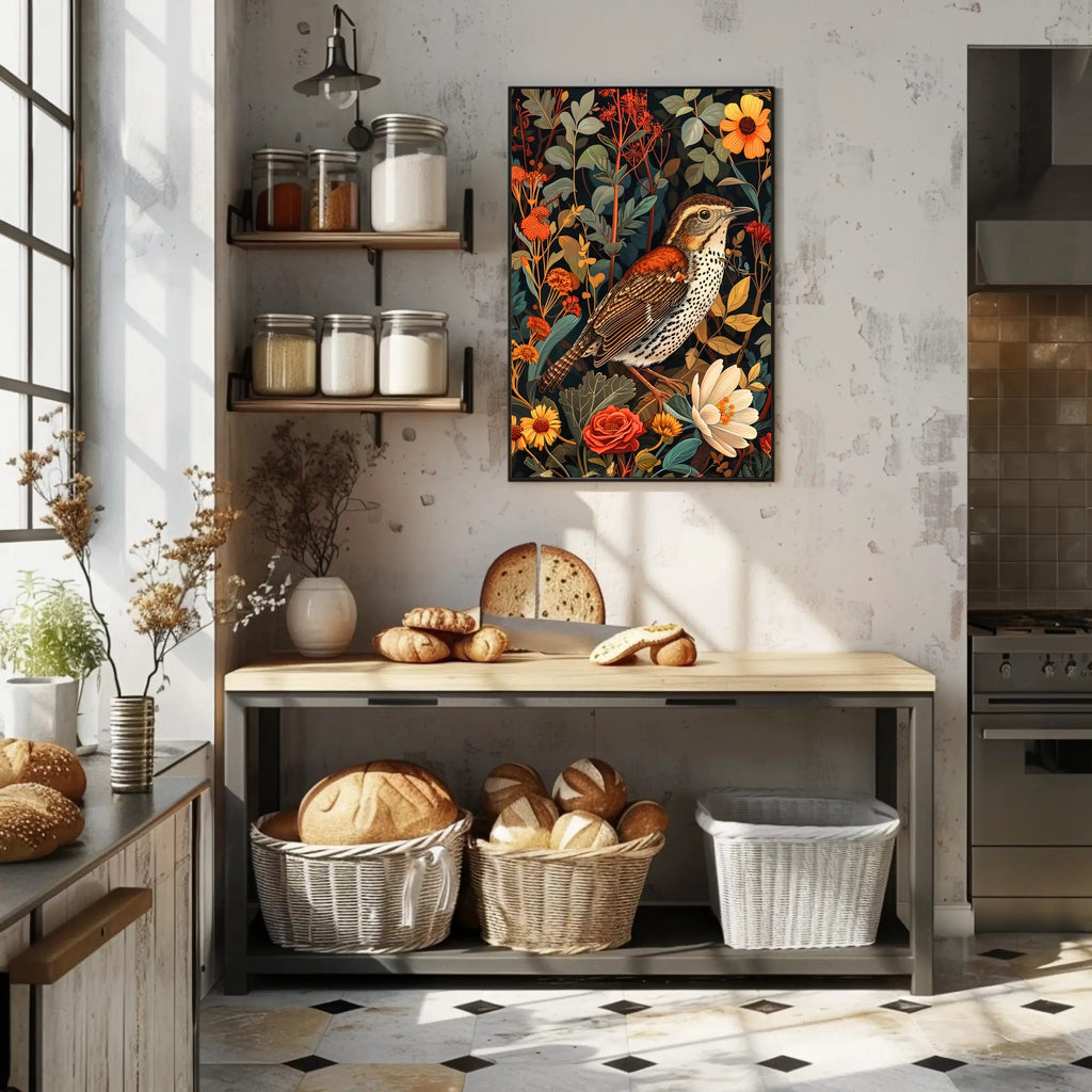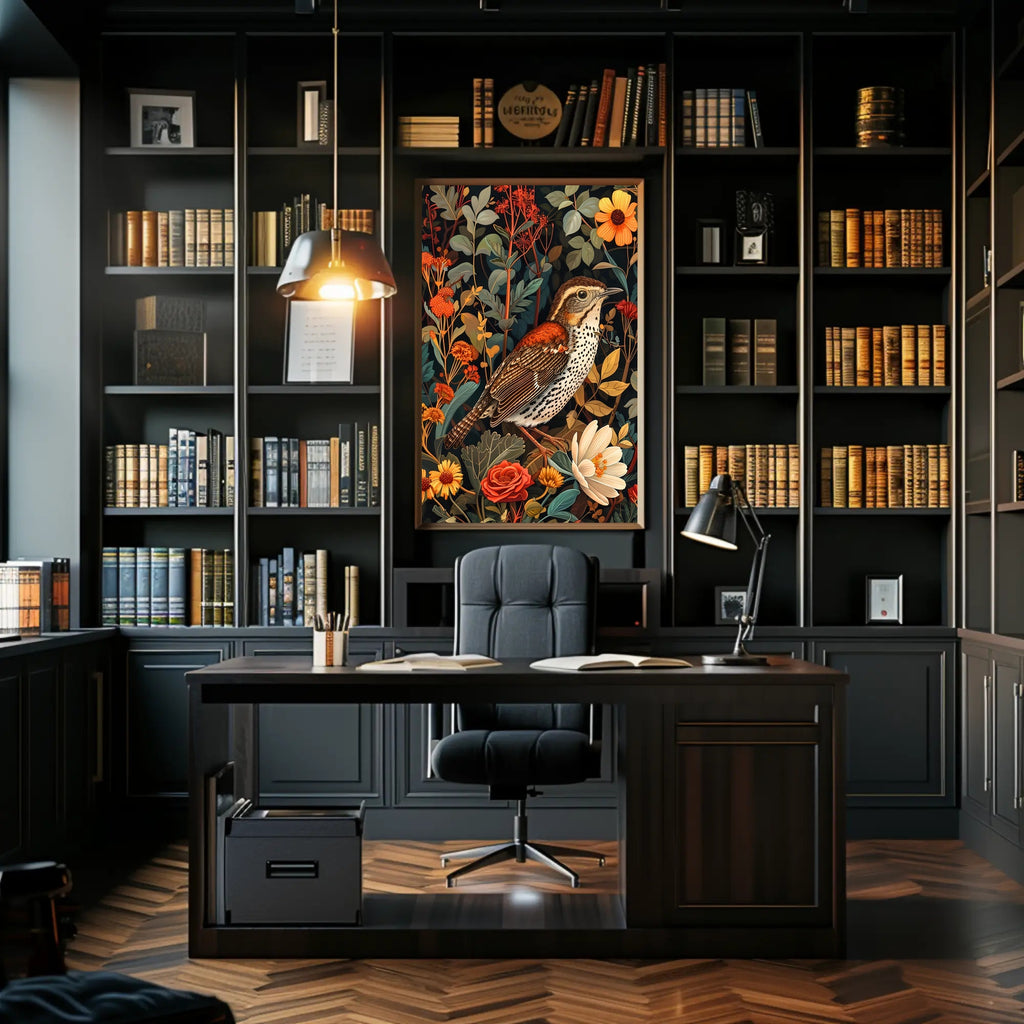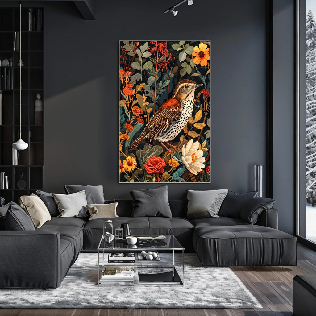 Bring the calm and color of the outdoors into your home with the Nature's Harmony Wall Art Print with Bird Design by PosterGoat. This stunning poster features an intricately illustrated bird perched among lush, stylized florals—rich warm tones and a deep, moody background create a striking focal point that complements minimalist and contemporary interiors.