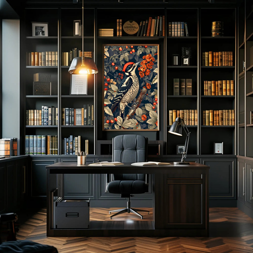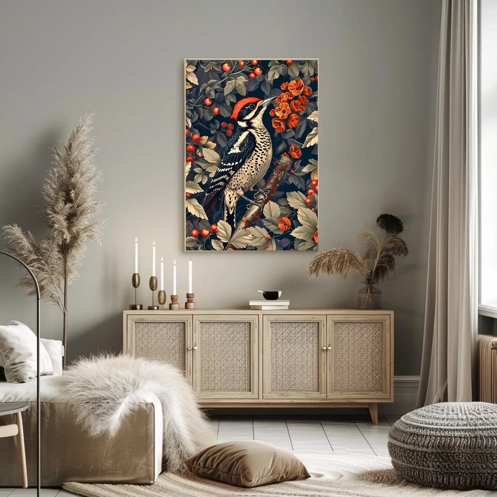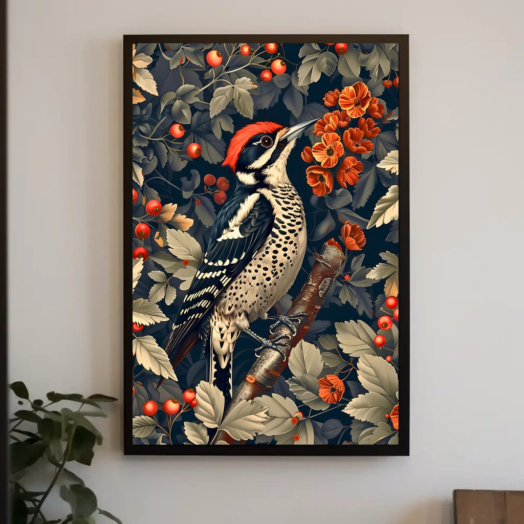 - Vivid botanical illustration: Intricate foliage, berries, and floral elements surround a finely rendered bird with a bold red crest, creating a captivating focal point for living rooms, bedrooms, or office walls.