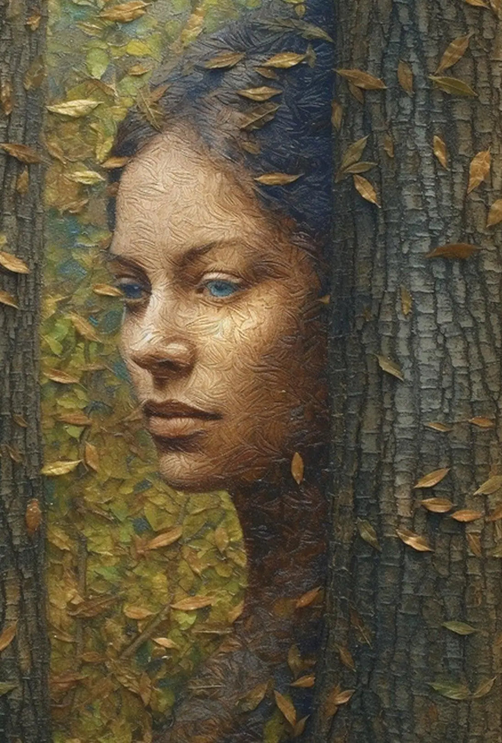 Bring a whisper of the wild and a bold piece of modern artistry to your walls with Nature's Harmony: Timeless Artistic Abstract Poster by PosterGoat. This striking print fuses abstract expression and pop-culture sensibility into a textured, oil-like portrait of a woman's face emerging from bark and drifting leaves — a conversation-starting focal point for any living room, home office, or gallery wall.