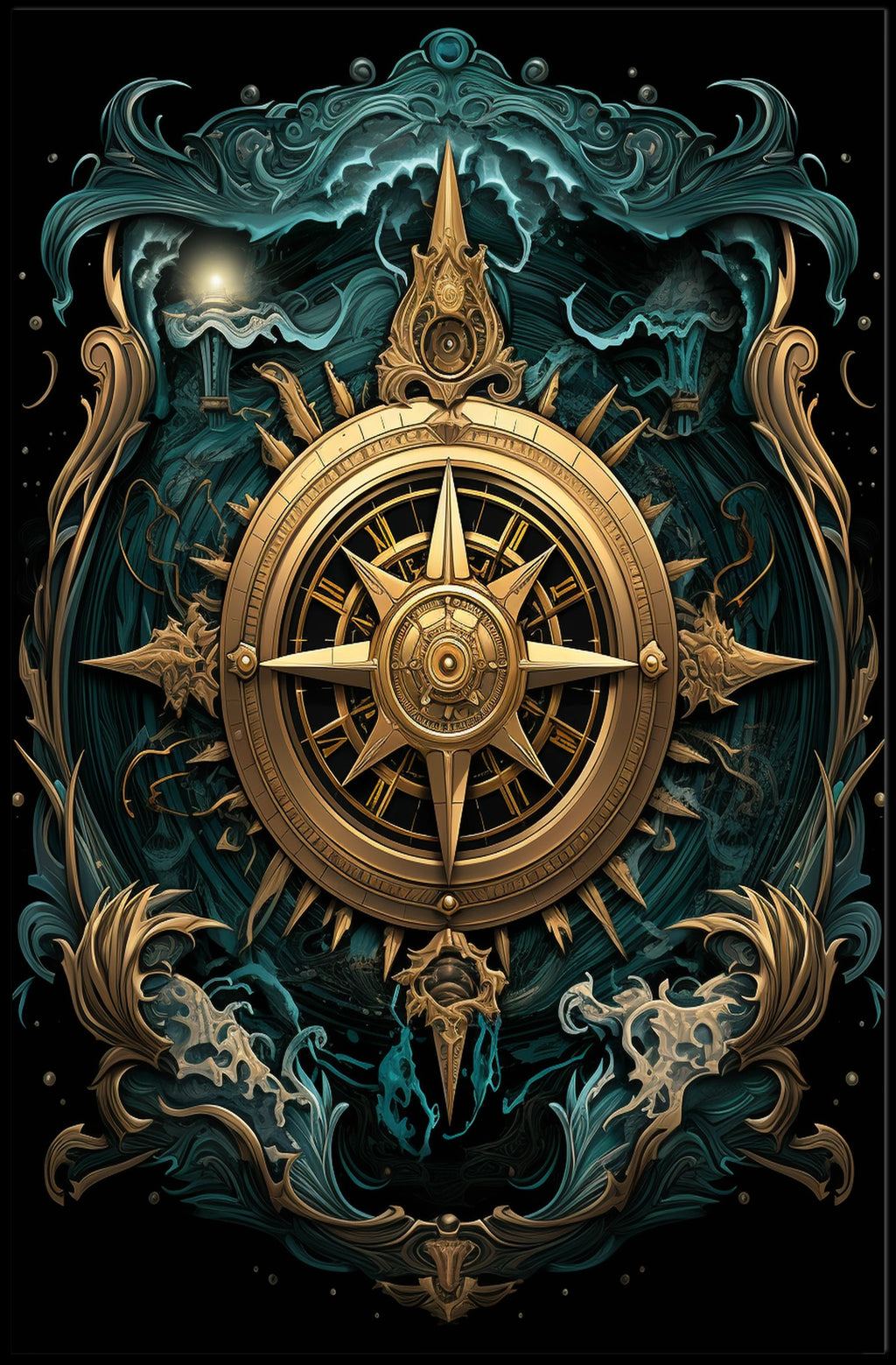 Navigate the allure of the unknown with Navigating the Mystical Seas, a captivating poster that centers a radiant golden compass, surrounded by ethereal waves and oceanic motifs. This art piece fuses fantasy with maritime adventure, inviting adventure lovers and dreamers to imagine uncharted waters and bold quests from the comfort of their wall.