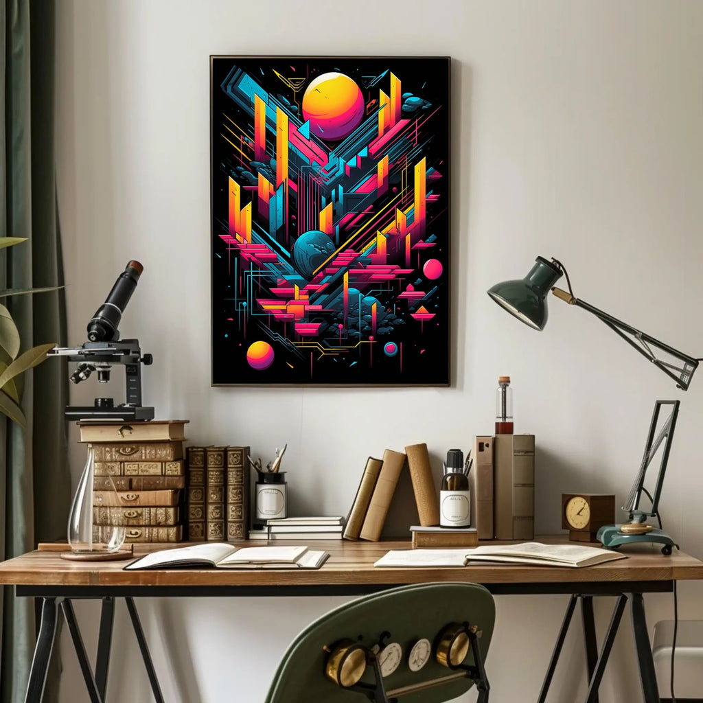 The Neon Geometric Cosmos Poster fuses futuristic neon glow with precise geometric shapes to evoke starry skies and urban horizons. This bold art print is designed for decor lovers and wanderlust spirits alike, adding energy and depth to living rooms, bedrooms, or creative workspaces while inviting reflection and conversation.
