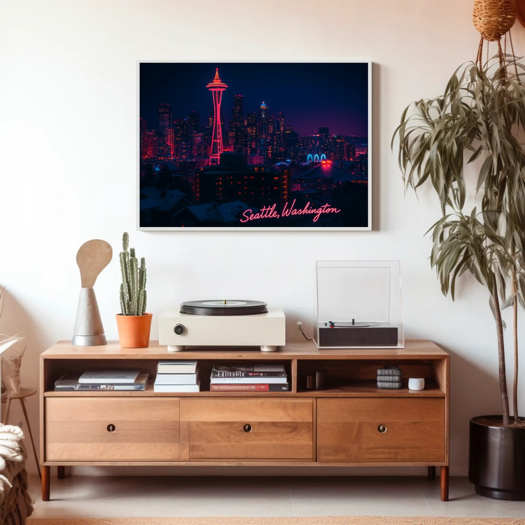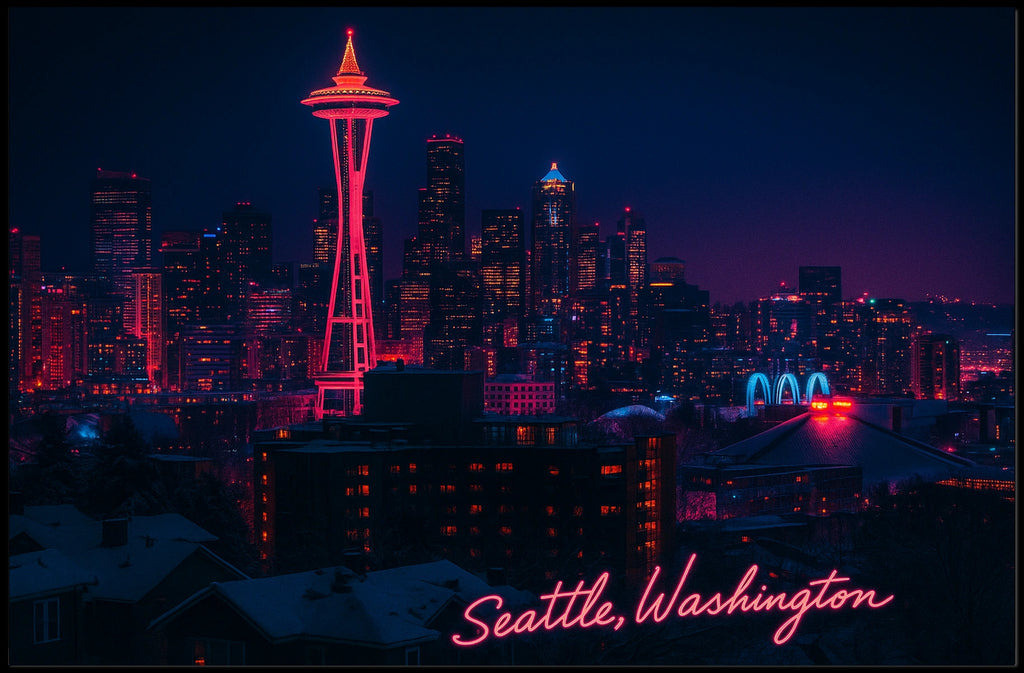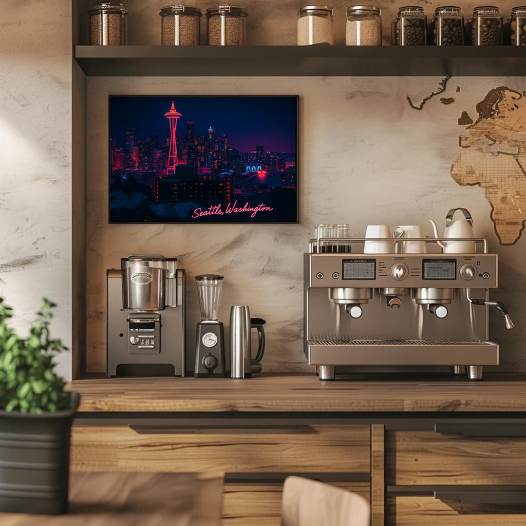 Bring the vibrant energy of neon nights and the charm of Seattle into your living space with this poster that doubles as wall art and a stylish souvenir for fans of scenic cityscapes.