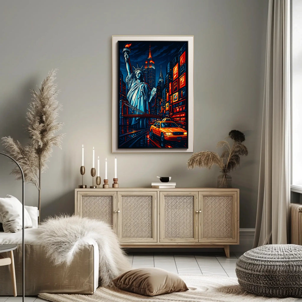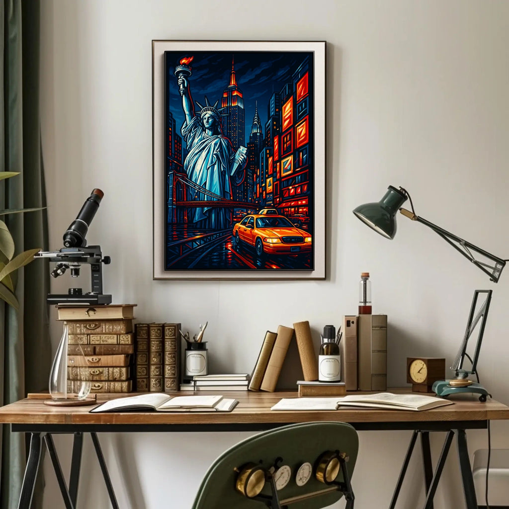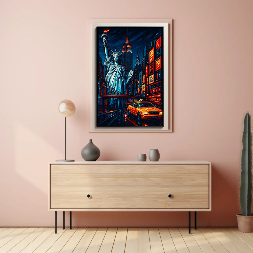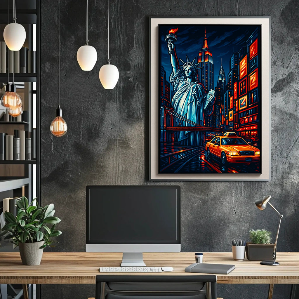 Elevate your decor with this bold NYC poster. A striking blend of liberty, taxis, and skyline—perfect for city lovers. Order Neon Nights in New York today and transform your space.