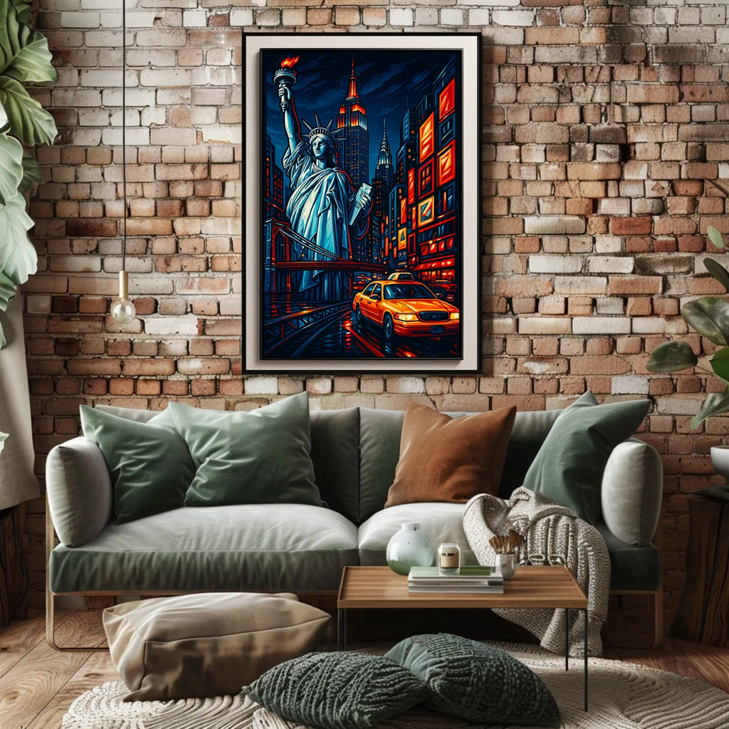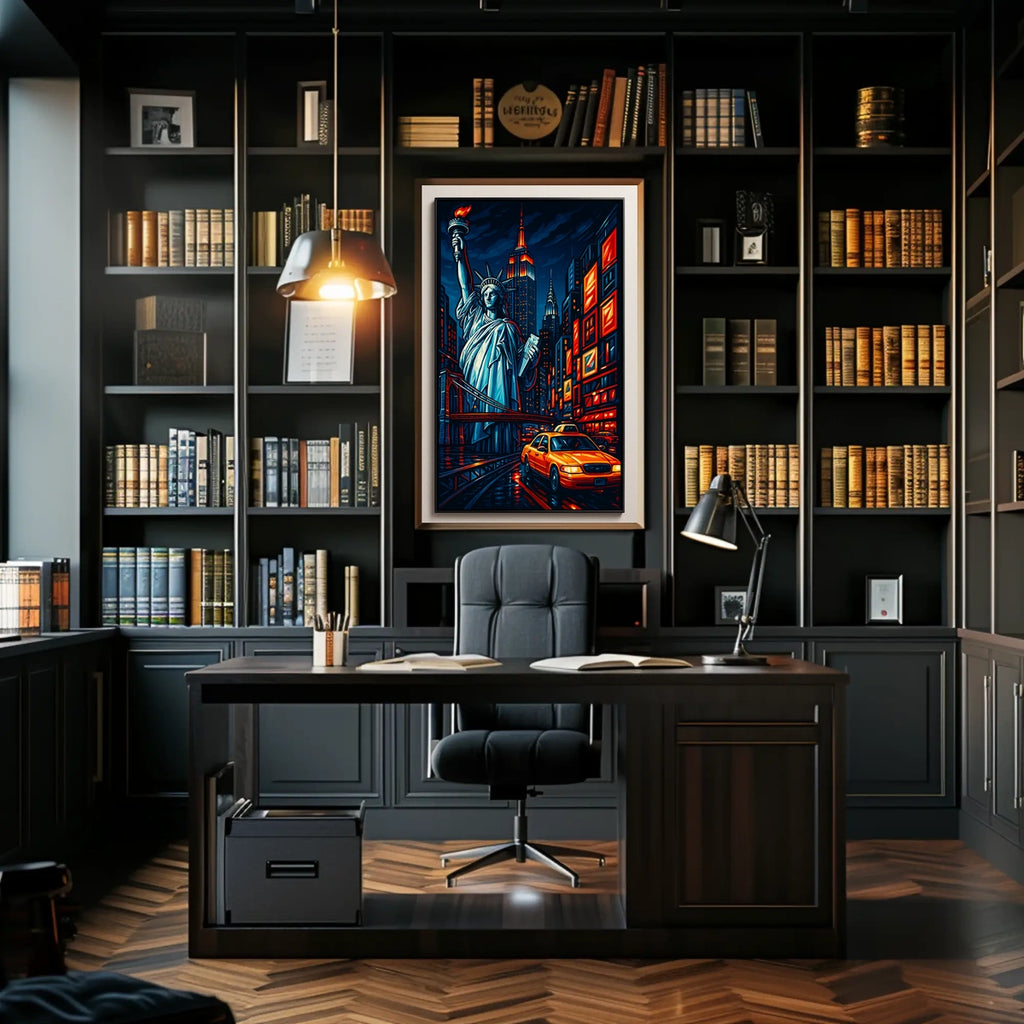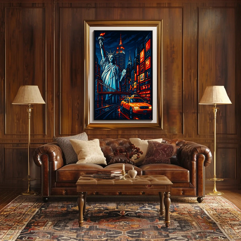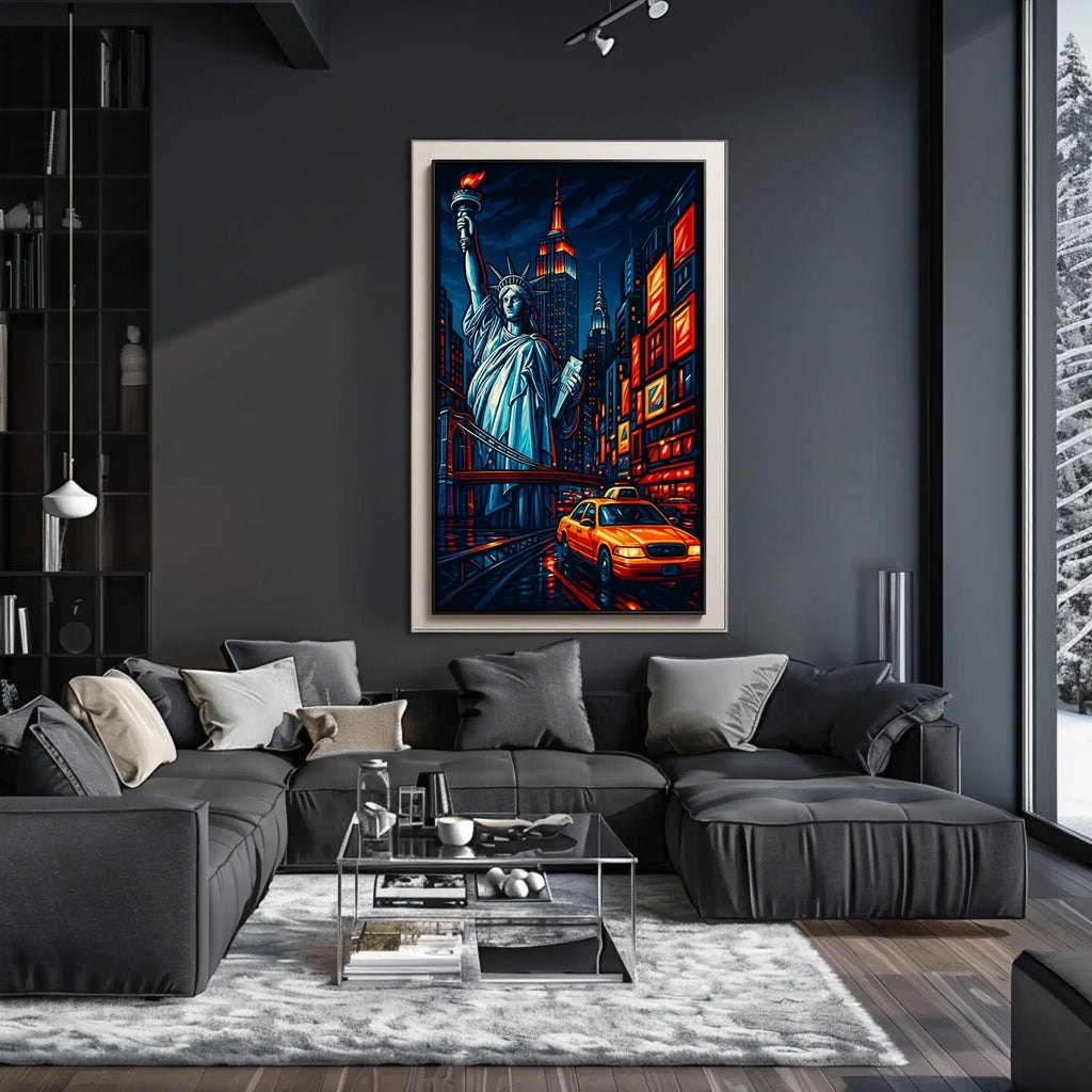 Elevate your decor with this bold NYC poster. A striking blend of liberty, taxis, and skyline—perfect for city lovers. Order Neon Nights in New York today and transform your space.