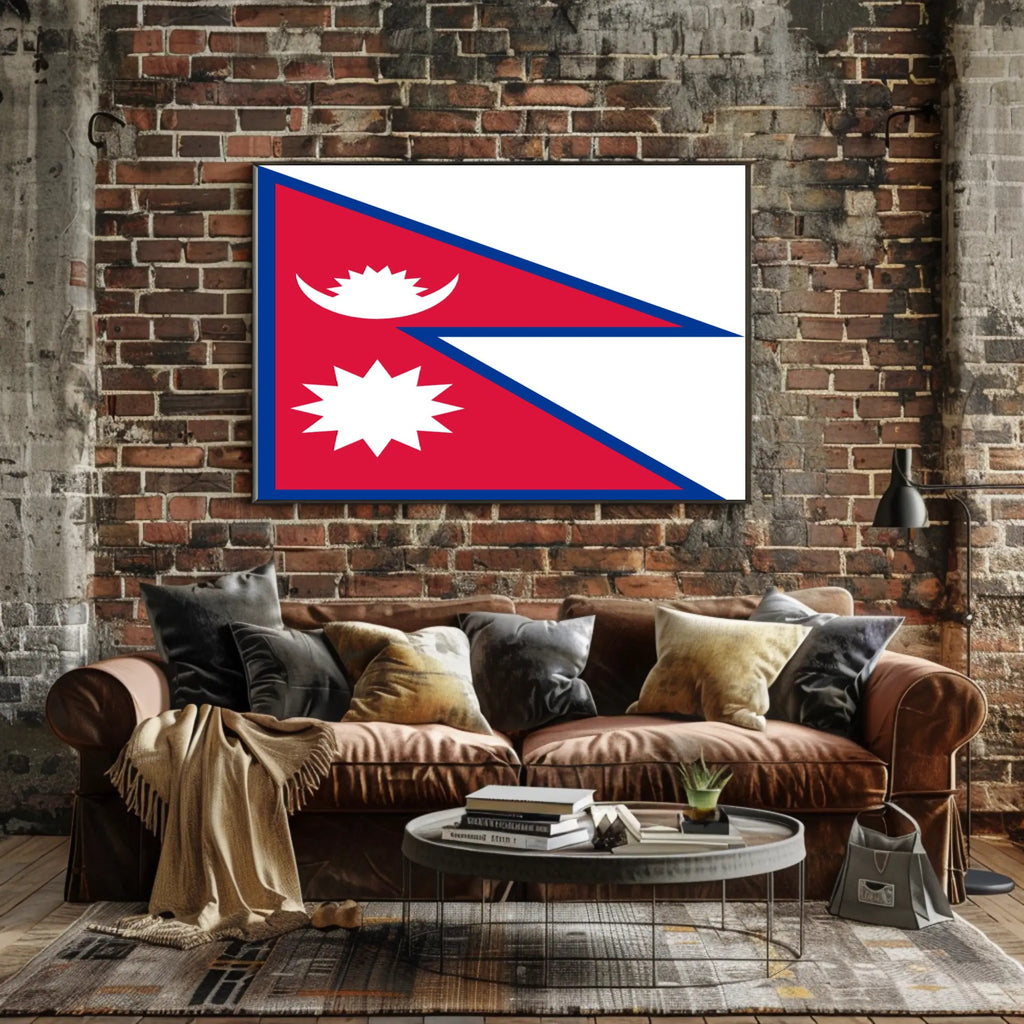 Celebrate Nepal's singular national emblem with this Nepalese Flag Distinctive Design Country Flag Poster from PosterGoat — a bold, minimalist wall art piece that highlights the flag’s unique non-rectangular double-pennon shape. Vivid crimson fills the geometric field, framed by a deep blue border, while the crisp white moon and sun symbols stand out with clean, graphic contrast — an ideal piece for lovers of world flags, cultural heritage, and contemporary home decor.