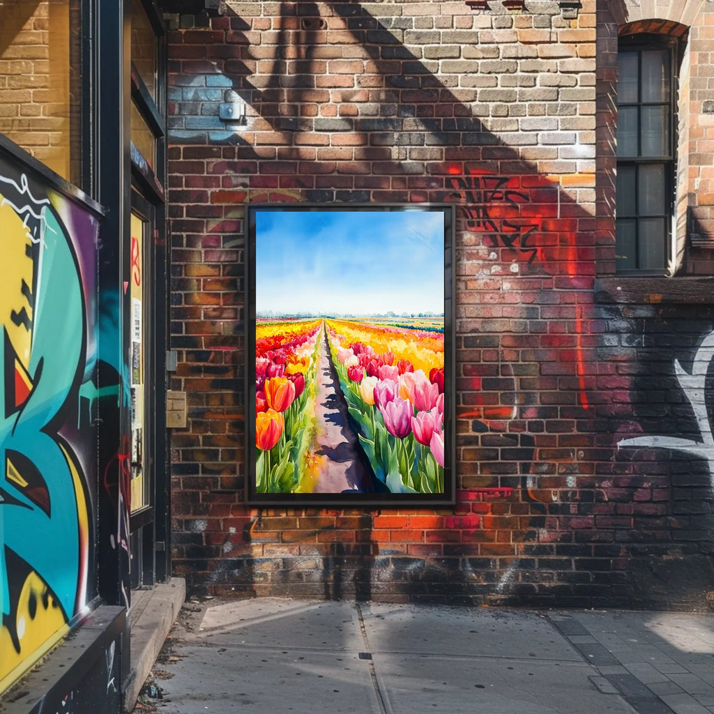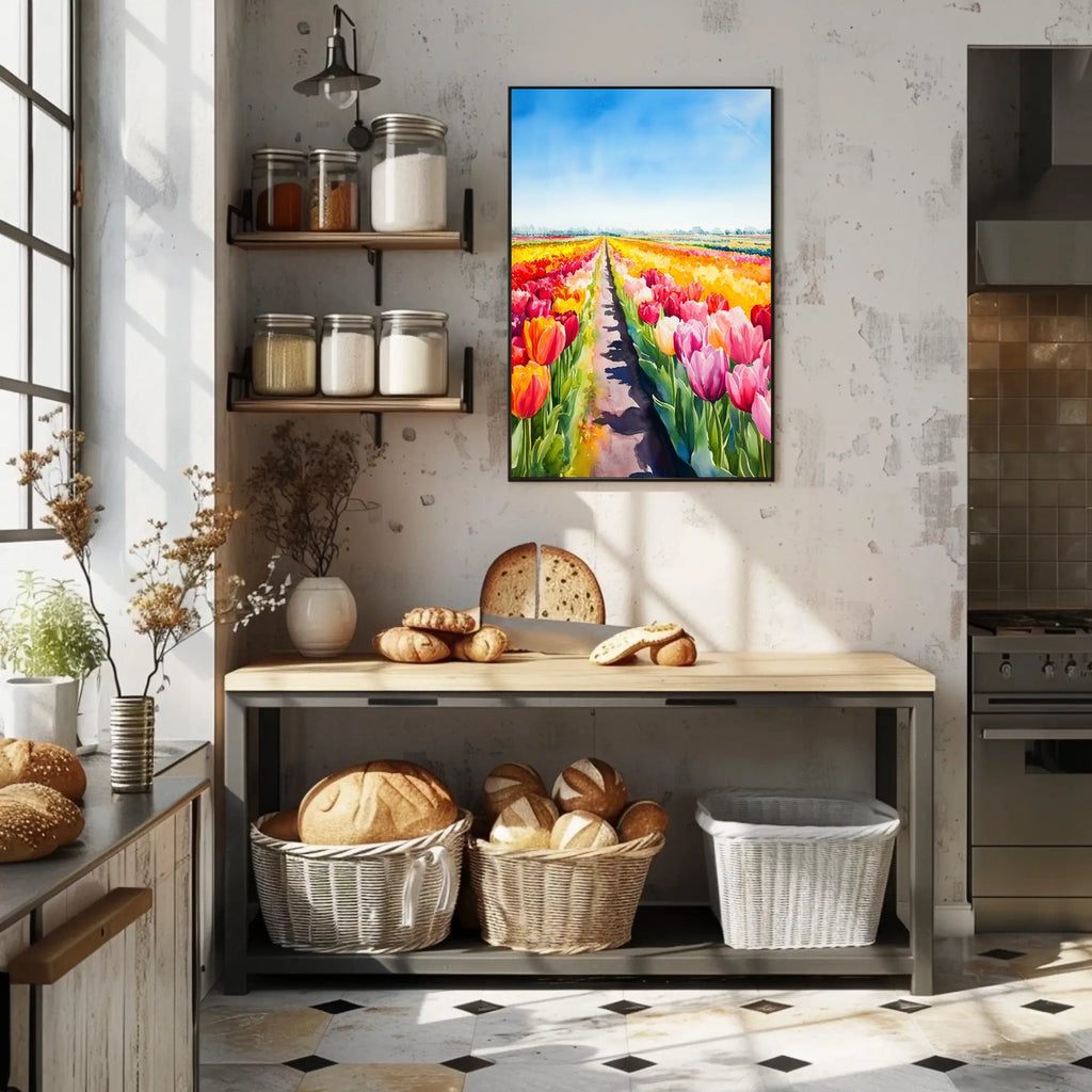 - Vivid, painterly depiction of endless tulip rows with a sunlit horizon that draws the eye into the distance