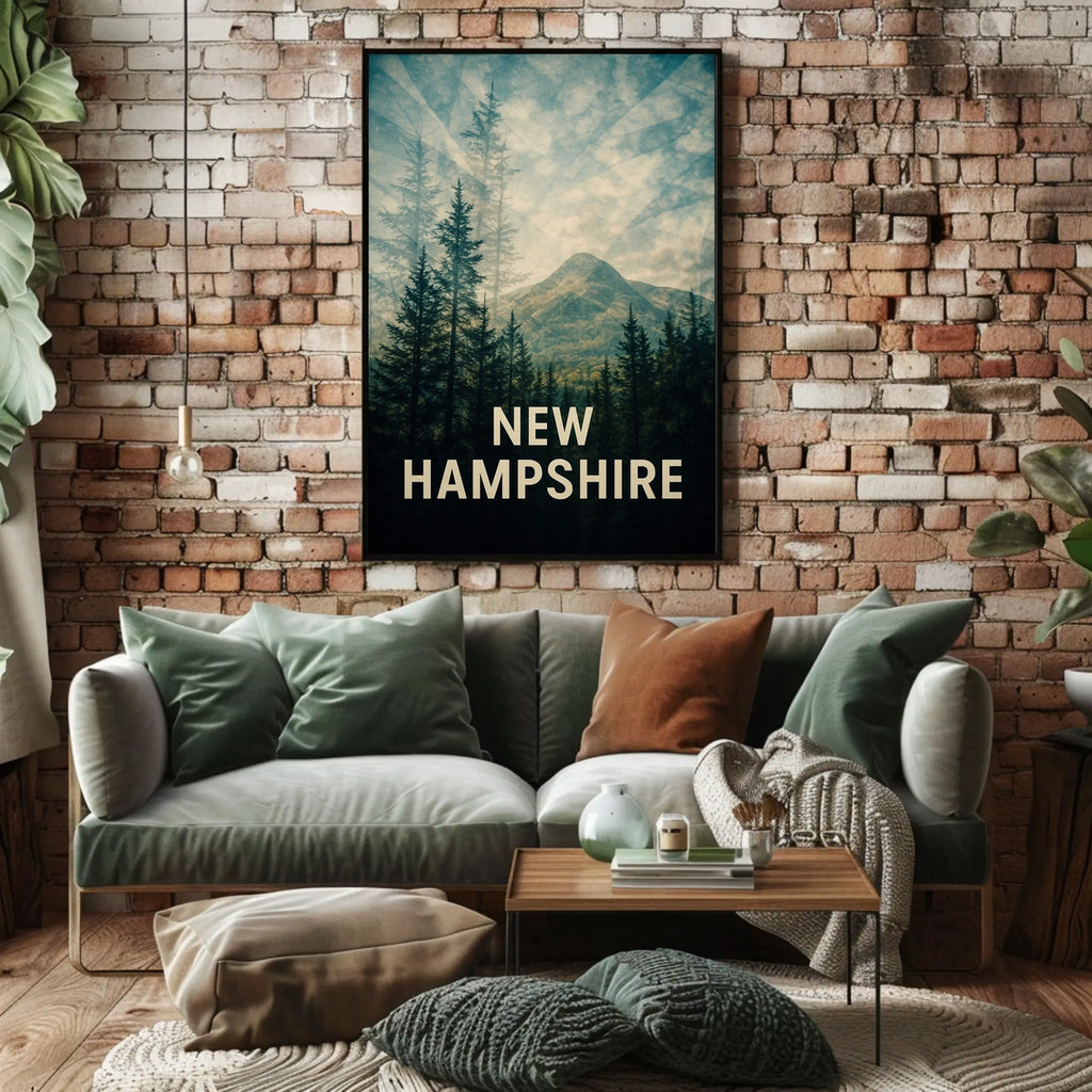 - Detailed design highlighting the rugged landscapes and serene wilderness of New Hampshire