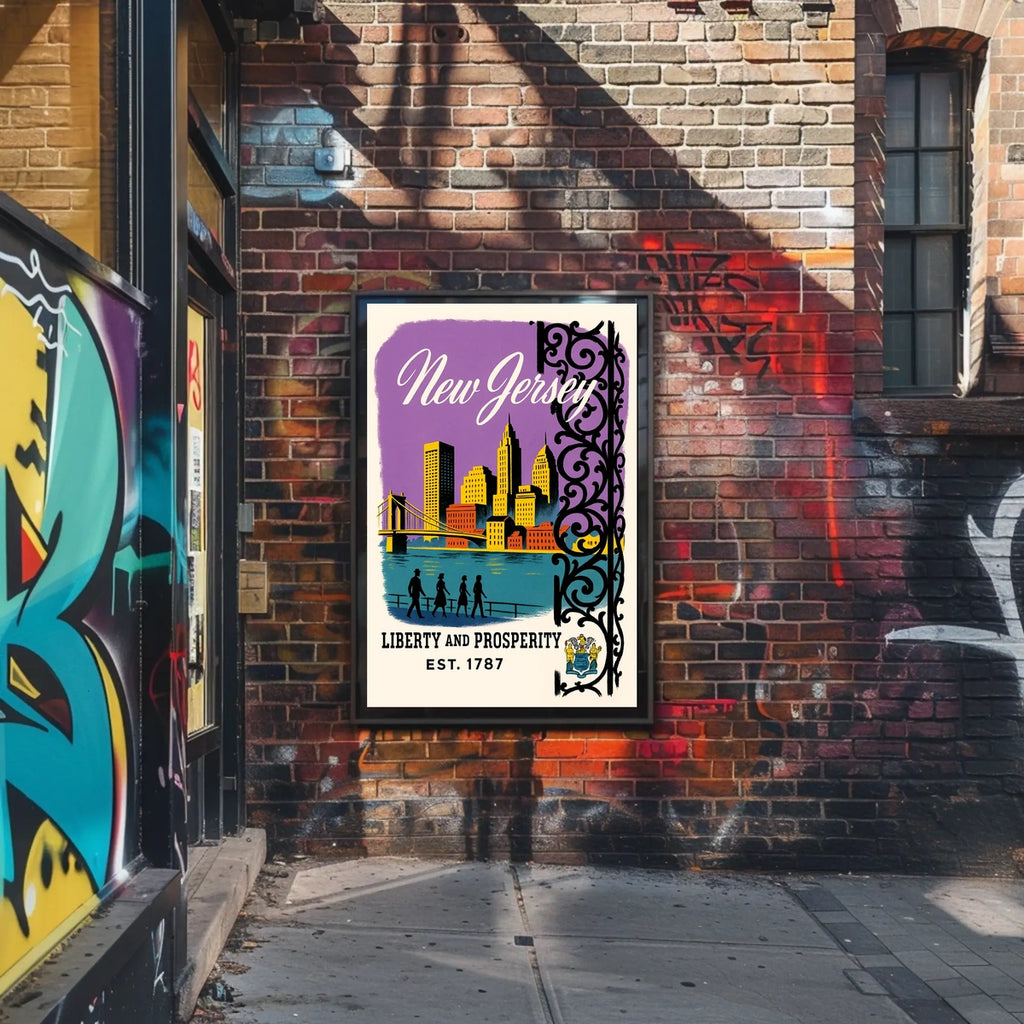 This poster presents a stylized depiction of a cityscape in New Jersey, featuring a prominent bridge under a captivating purple sky. The design elegantly incorporates the state's motto, 'Liberty and Prosperity,' offering a vintage aesthetic that captures the essence of New Jersey's charm and character. The blend of retro elements with modern design techniques makes this poster a unique piece of art, perfect for anyone who appreciates both history and contemporary style. The poster's color scheme and intricate details create a visually appealing representation of New Jersey's urban landscape, making it an ideal addition to any room decor or collection of state-themed memorabilia.