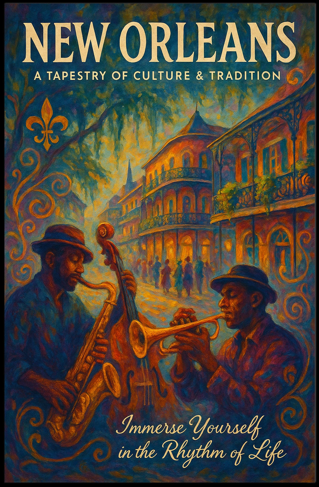 Intro: Dive into the vibrant spirit of New Orleans with this poster, celebrating music, culture, and heritage. Its warm colors and lively imagery capture the city’s rhythm and charm, making it a timeless piece for any room and mood.