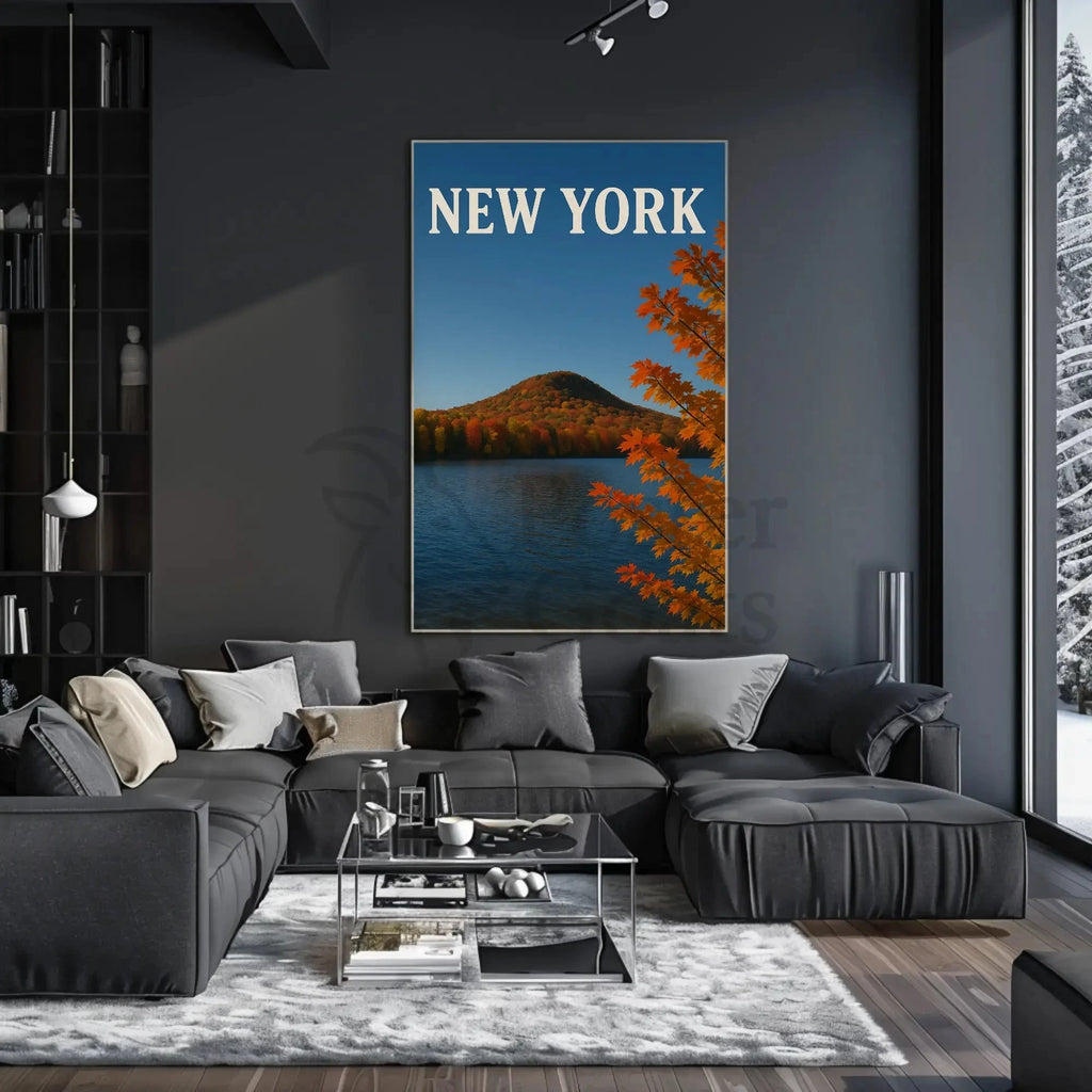 Elevate your wall with PosterGoat's New York Autumn Landscape Travel Poster—add to cart now to bring the tranquil mood of the Catskills/Adirondacks home today.