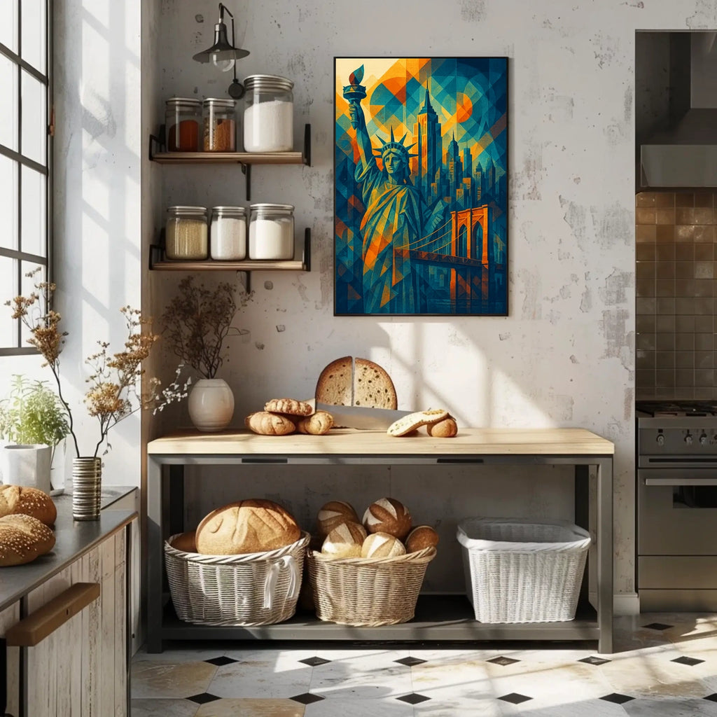 - Iconic landmarks reimagined - A bold abstract layout fuses the Statue of Liberty with the Empire State Building and Brooklyn Bridge into a single centerpiece, creating instant character and conversation.