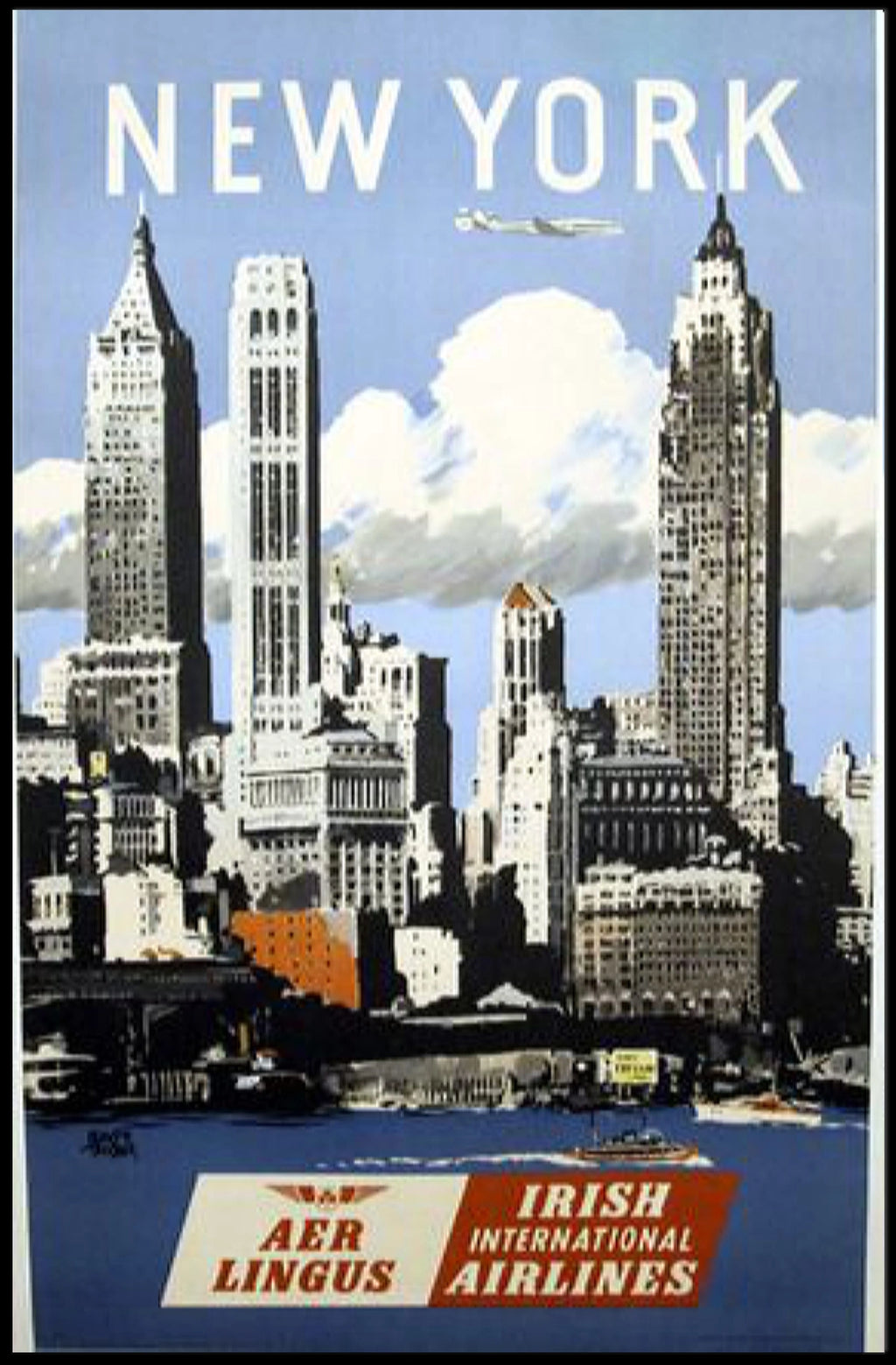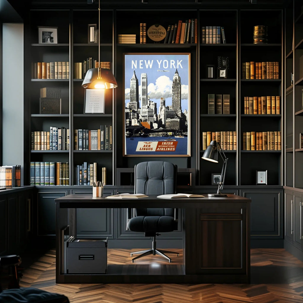 Experience the vibrant spirit of travel with this vintage poster featuring New York City's iconic skyline. Rendered in a mid-century illustration style, bold lines and a restrained color palette evoke classic travel ads and timeless wanderlust.
