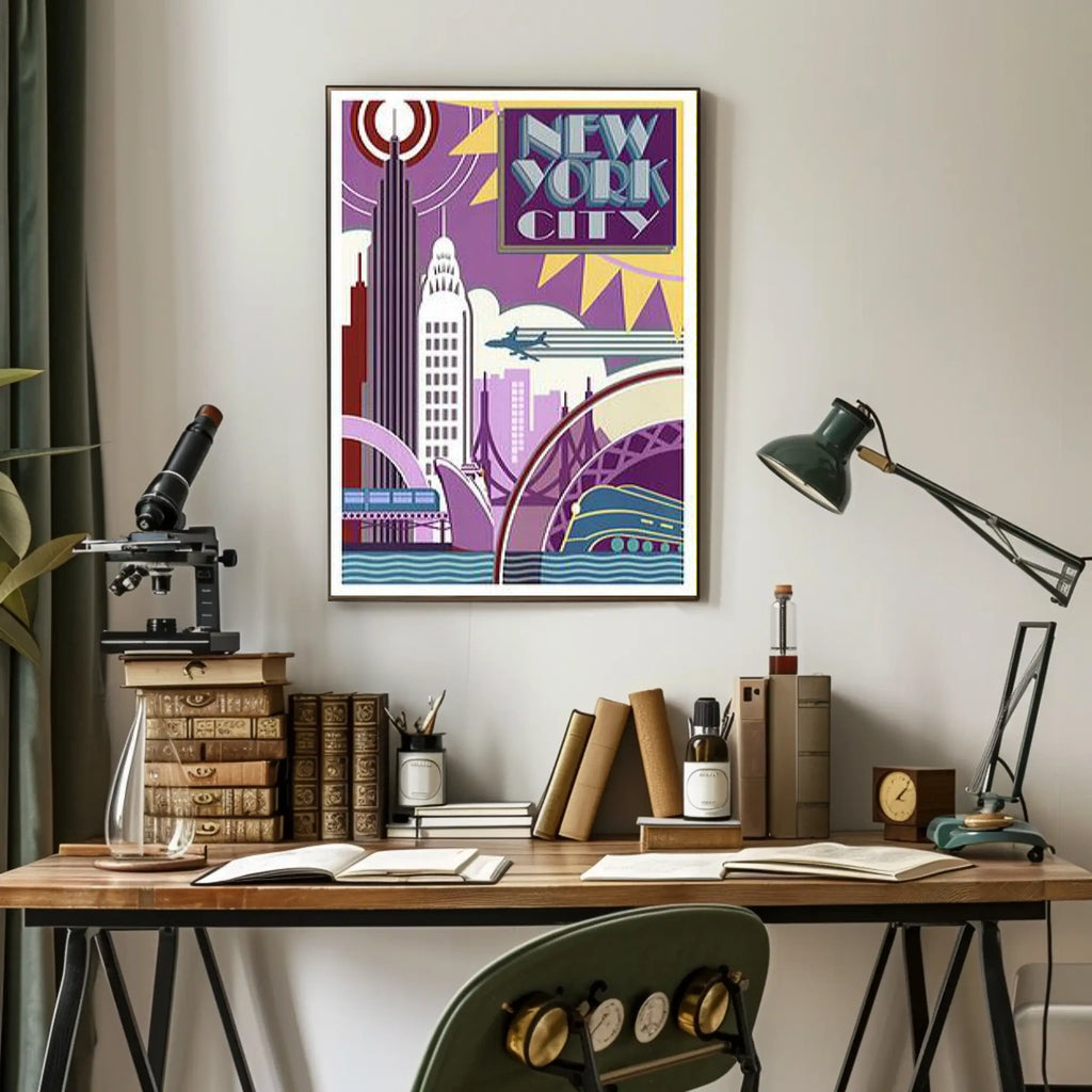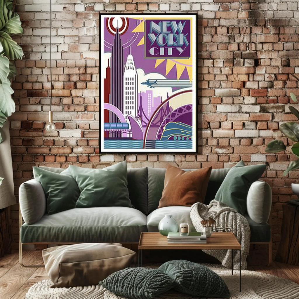 Immerse yourself in the vibrant energy of New York City with this captivating Art Deco poster. This stunning piece captures the essence of the city's iconic skyline, featuring stylized architectural marvels like the Chrysler Building and a bridge reminiscent of the Brooklyn Bridge. With its dynamic scene and bold geometric designs, it's perfect for adding a touch of urban sophistication to your home or office decor, making it a must-have for art deco enthusiasts and New York lovers alike.