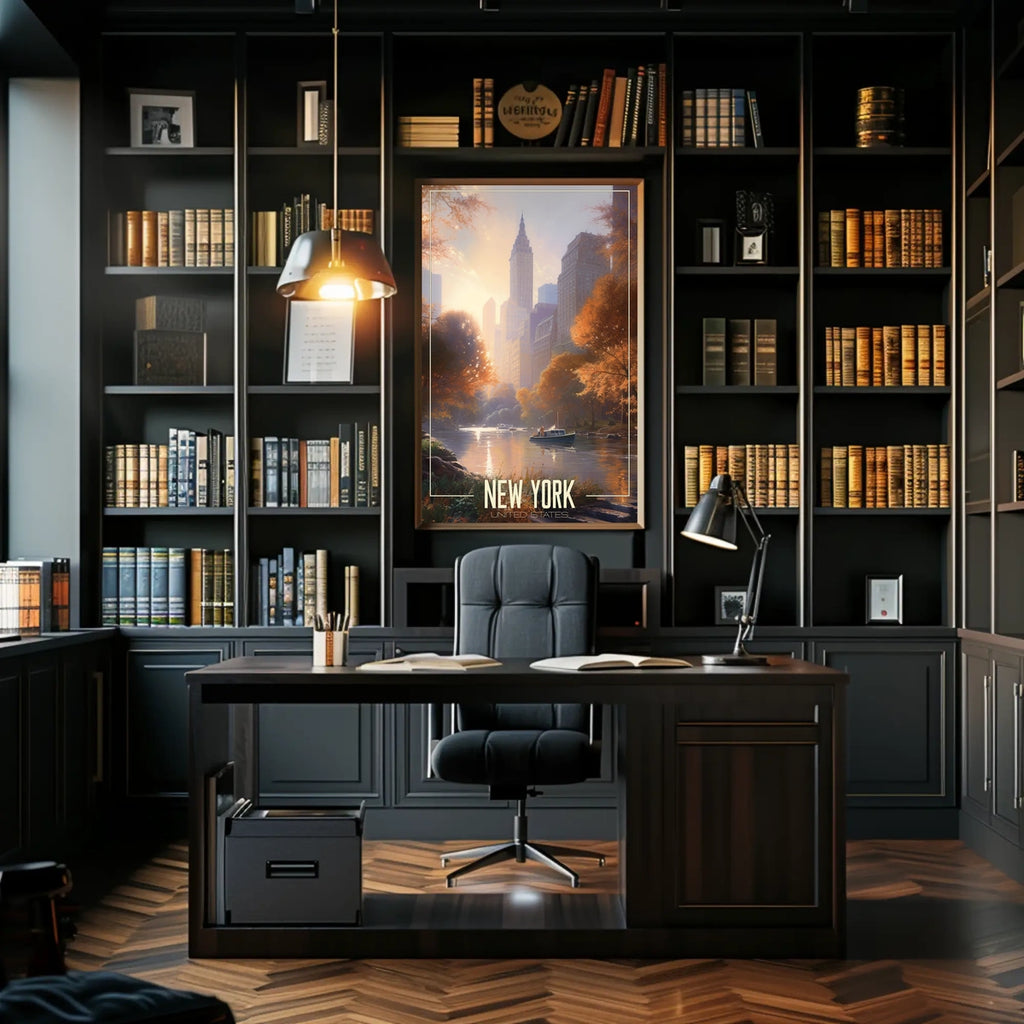 This poster captures a serene autumn scene in New York City's Central Park, where orange and gold foliage frames a tranquil waterway. A small boat drifts by as skyscrapers glow with a warm dusk light, blending city energy with nature’s calm. It adds refined seasonal charm to any room and makes a statement about quiet beauty in an urban world.