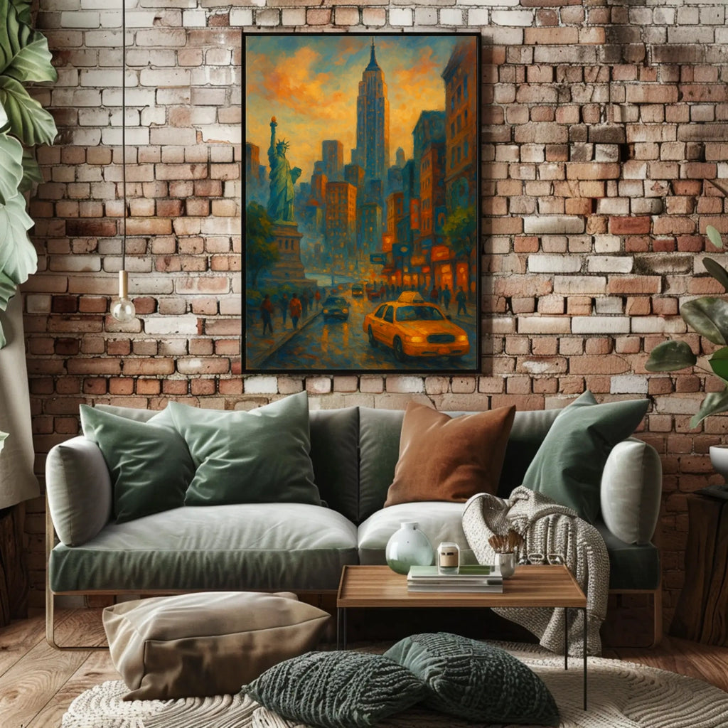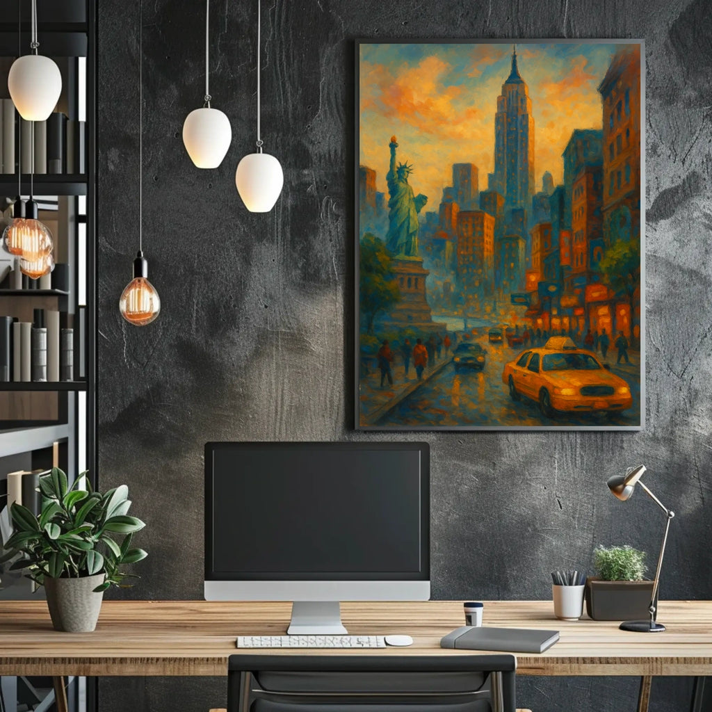 Experience the vibrant energy of New York City captured at dusk in this stunning impressionistic poster. A bustling street scene blends iconic symbols—the Statue of Liberty and an Empire State Building-inspired silhouette—into a luminous moment that feels both nostalgic and modern, making it a bold centerpiece for any contemporary wall. Perfect for energizing living rooms, studios, and entryways.