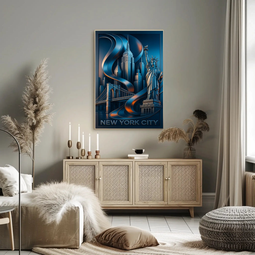 Immerse your space in the electric energy of New York City with this Futuristic Landmarks art poster. This modern reinterpretation captures the city’s iconic skyline through bold shapes and a cool blue palette, offering a sophisticated centerpiece that sparks imagination and urban style.