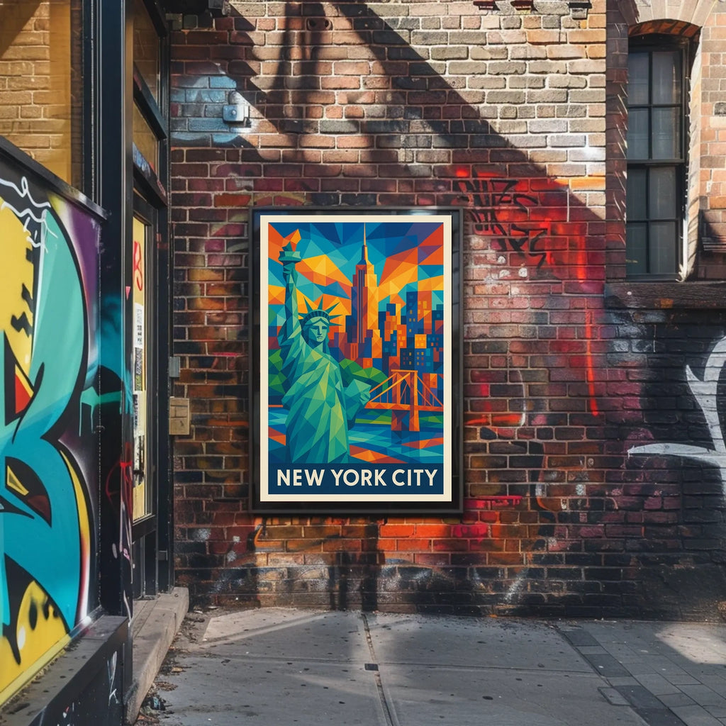 Experience the electric energy of New York with this geometric art poster that blends iconic landmarks—Statue of Liberty, a stylized Empire State Building, and a Brooklyn Bridge-inspired silhouette—into a bold mosaic of color and shape. Perfect for urban lovers and art enthusiasts, it adds a cosmopolitan heartbeat to any room.