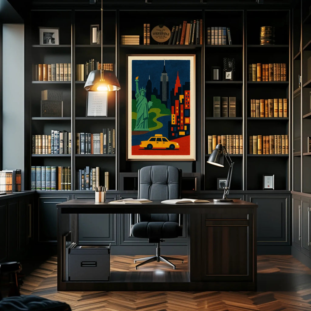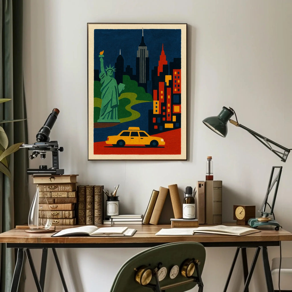 Experience the vibrant essence of New York City with this stunning art poster, celebrating iconic landmarks like the Statue of Liberty and the Empire State Building. The bold geometric skyline and a bright yellow taxi foreground capture the city’s dynamic spirit, adding energy and style to any wall.