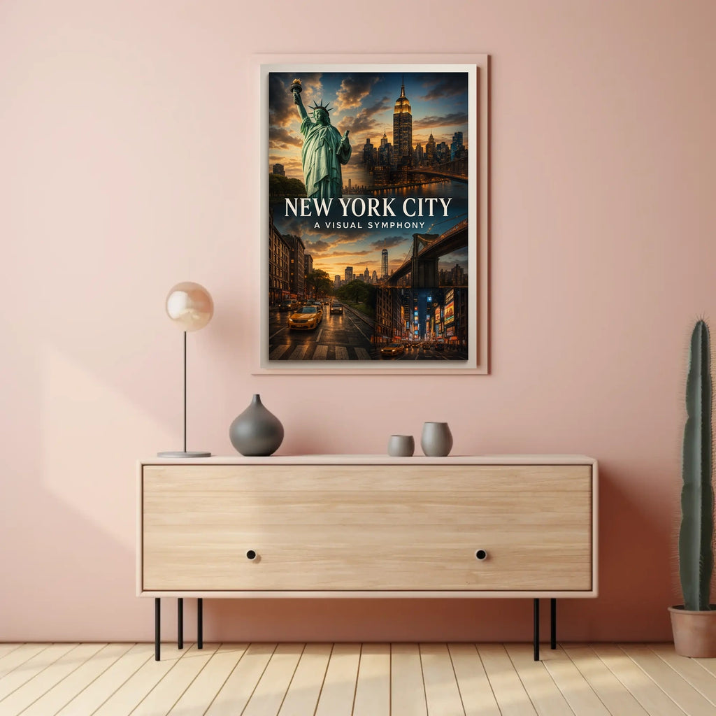 Experience the vibrant energy of New York City with this photorealistic poster, capturing the city’s iconic landmarks, bustling streets, and warm glow. From the Statue of Liberty to the Brooklyn Bridge and the skyline’s dramatic silhouettes, this artwork brings the city that never sleeps into your space with stunning clarity and heart. Ideal for living rooms, offices, or gallery walls.