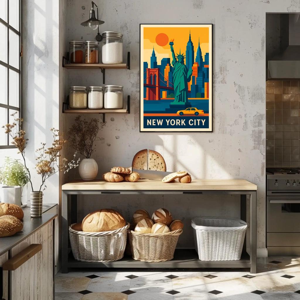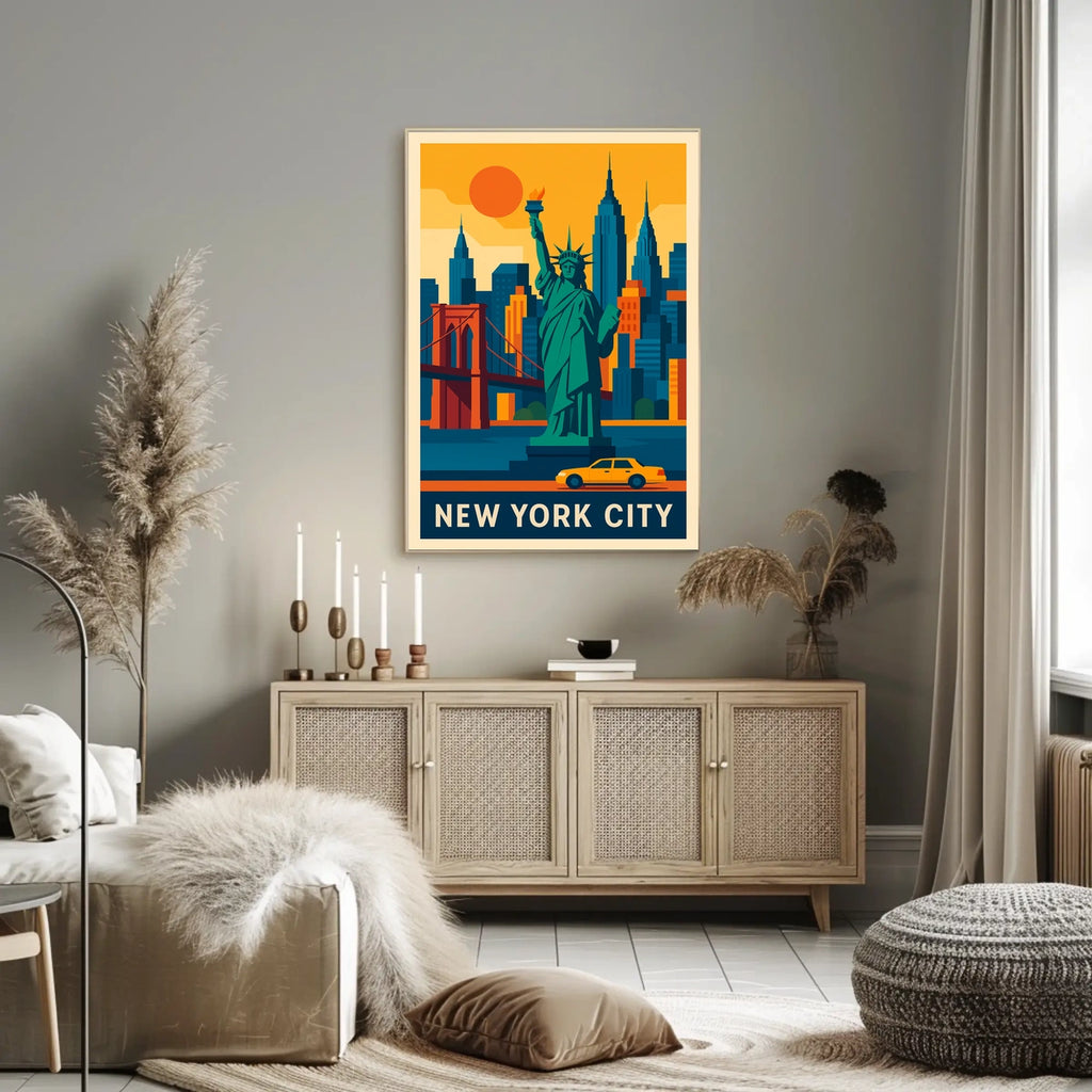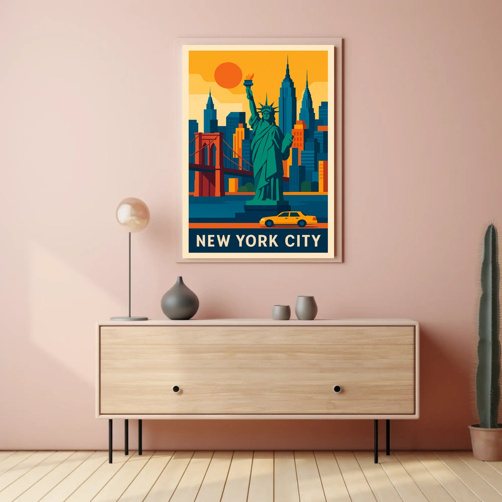 Immerse your space in the electric energy of New York City with this modern poster. Bold, flat colors spotlight legendary landmarks—the Statue of Liberty, a bright yellow taxi, the Brooklyn Bridge, and a sleek skyline—creating a stylish centerpiece for any wall.