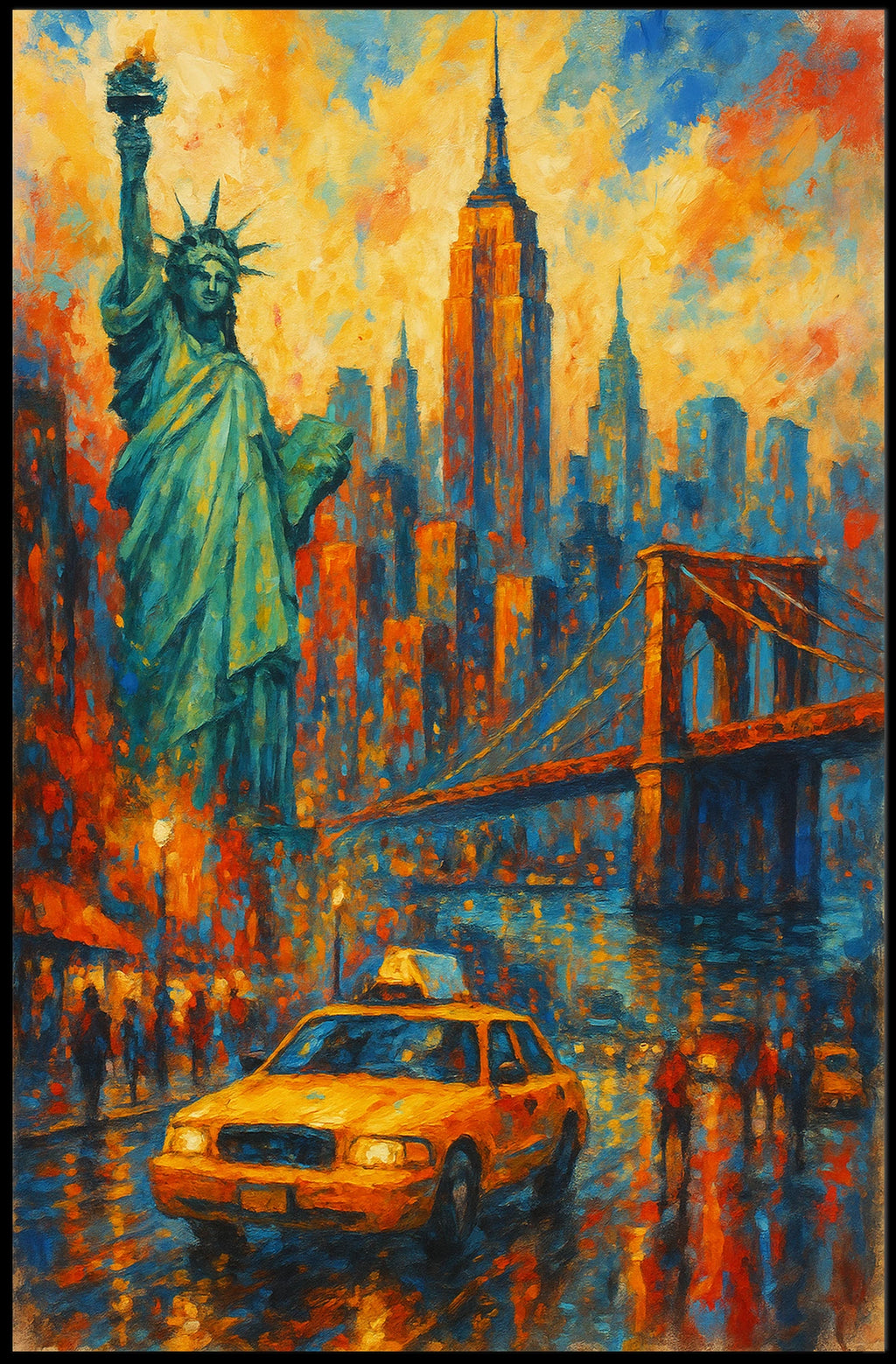 Immerse yourself in the vibrant energy of New York City with this impressionistic art poster. Bold brushstrokes and luminous color capture iconic landmarks—Statue of Liberty, Empire State Building, and Brooklyn Bridge—while a sunny yellow taxi adds kinetic charm. Perfect for living rooms, home offices, or creative spaces, it brings a slice of the city’s dynamic spirit into your decor.