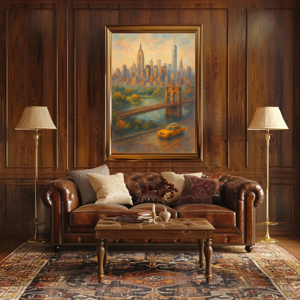 Immerse yourself in the vibrant energy of New York City with this impressionistic poster. The iconic skyline, Brooklyn Bridge, and a bright yellow taxi are rendered in a warm palette of oranges, blues, and yellows to spark optimism and urban chic.