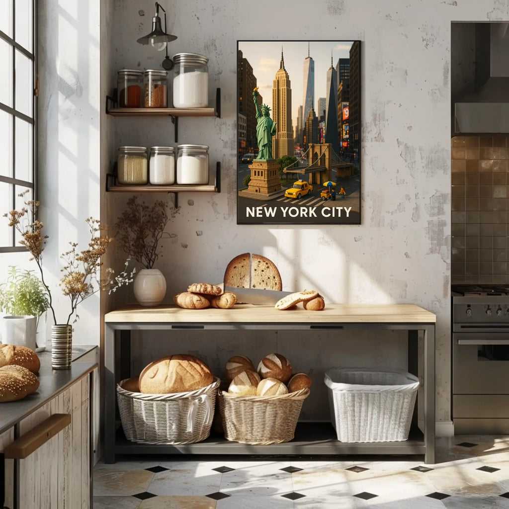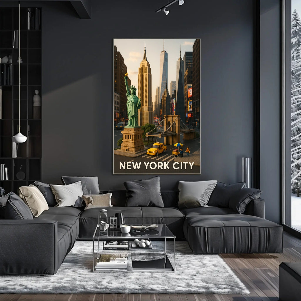 Intro: Immerse yourself in the vibrant spirit of New York City with this captivating NYC landmarks poster, featuring an artistic diorama of iconic landmarks. The Statue of Liberty, Empire State Building, and Brooklyn Bridge are rendered as charming miniature models, set against a bustling cityscape. A playful yellow taxi adds a pop of color and nostalgic energy that brightens any wall.