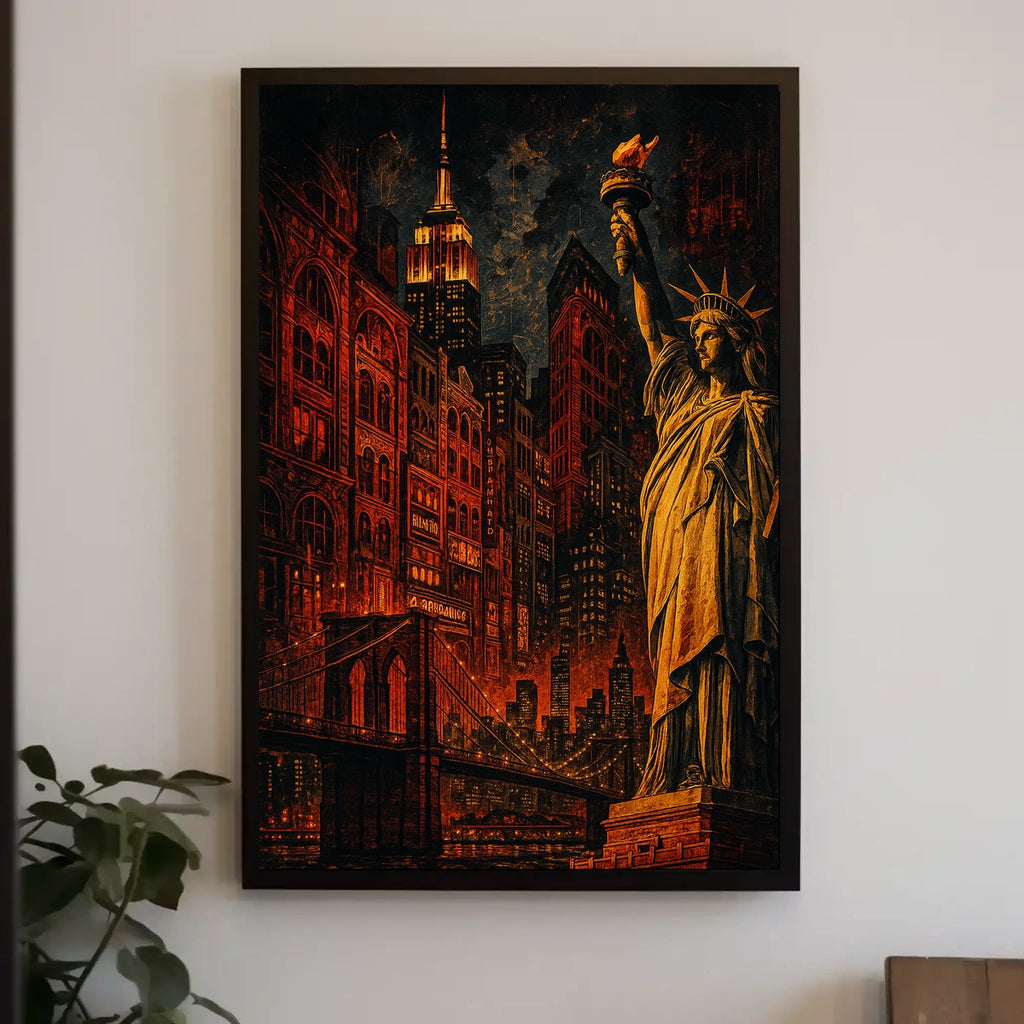 Capture the electric allure of New York City with this Nightscape Vintage Art Poster. A cinematic skyline glows under a fiery orange night sky, featuring the Statue of Liberty, Brooklyn Bridge, and the Empire State Building. Timeless retro charm meets contemporary detail for bold, modern wall decor.