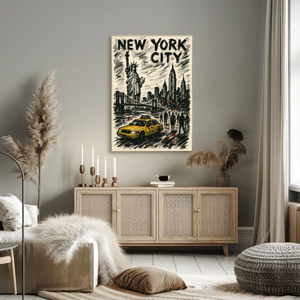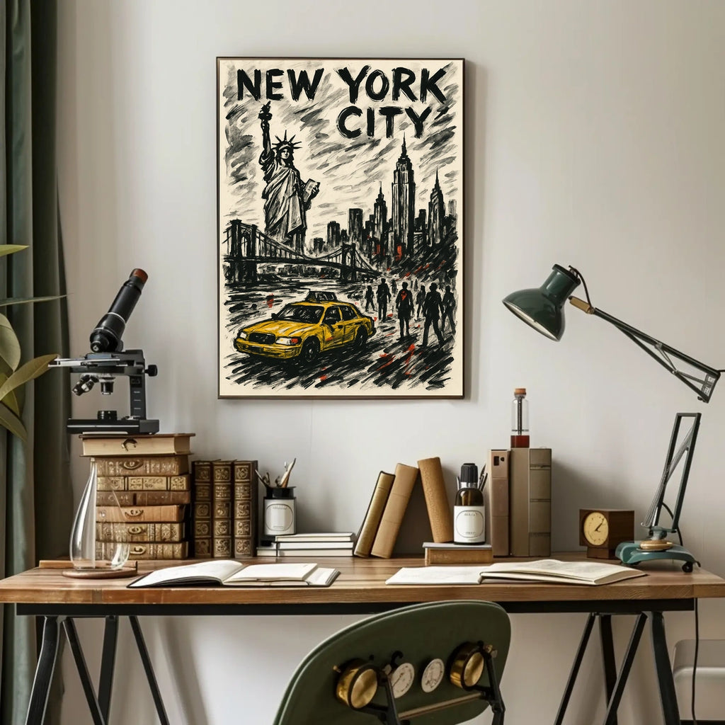 Immerse your space in the gritty allure of New York City with this striking poster. Printed to capture the neon glow and shadowed avenues, it centers on iconic landmarks like the Statue of Liberty and the towering skyline, offering a moody, cinematic focal point for any room.