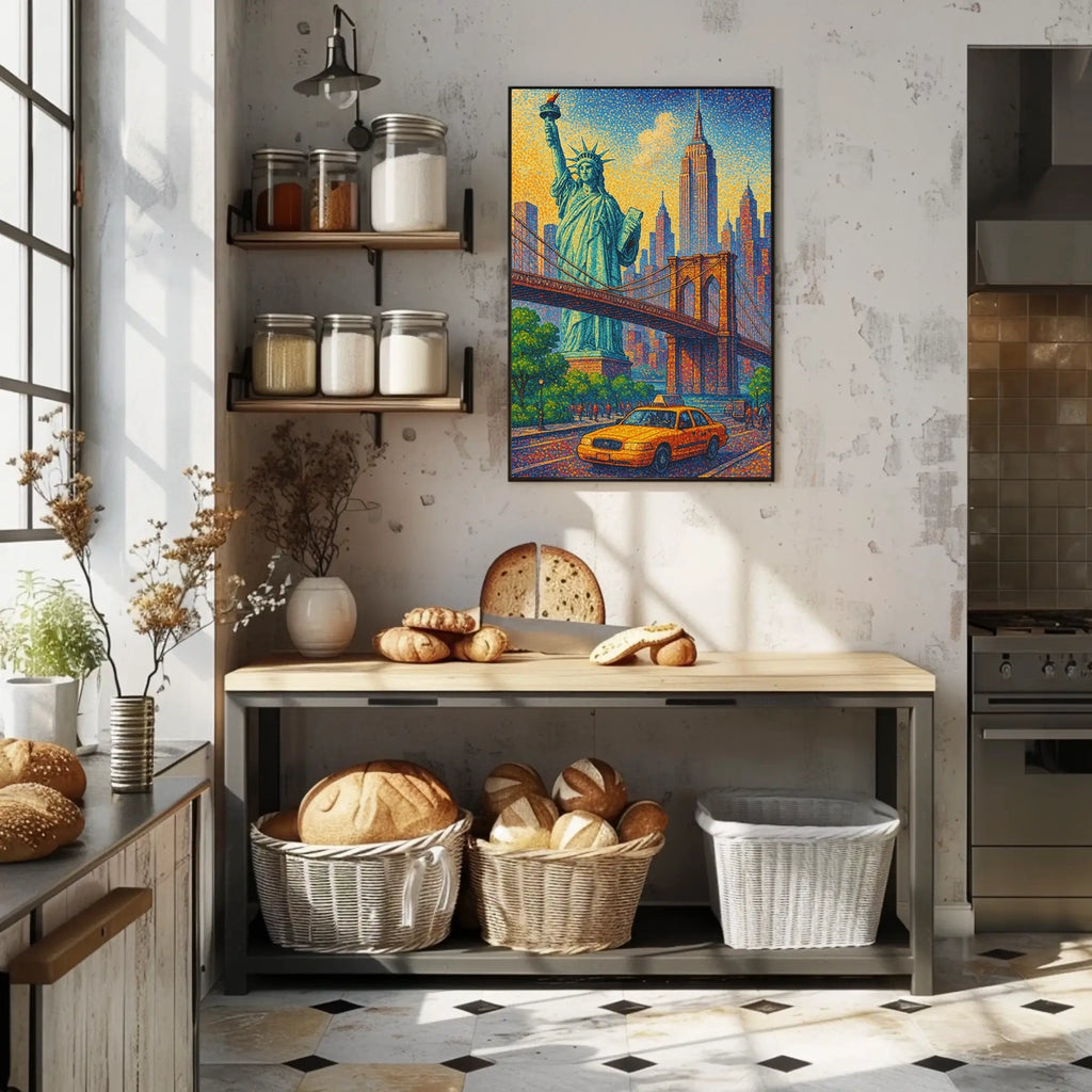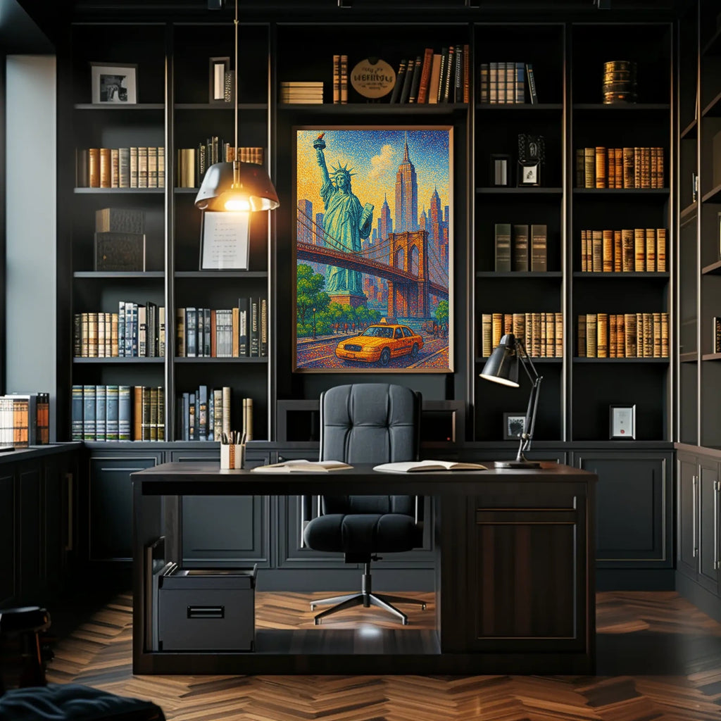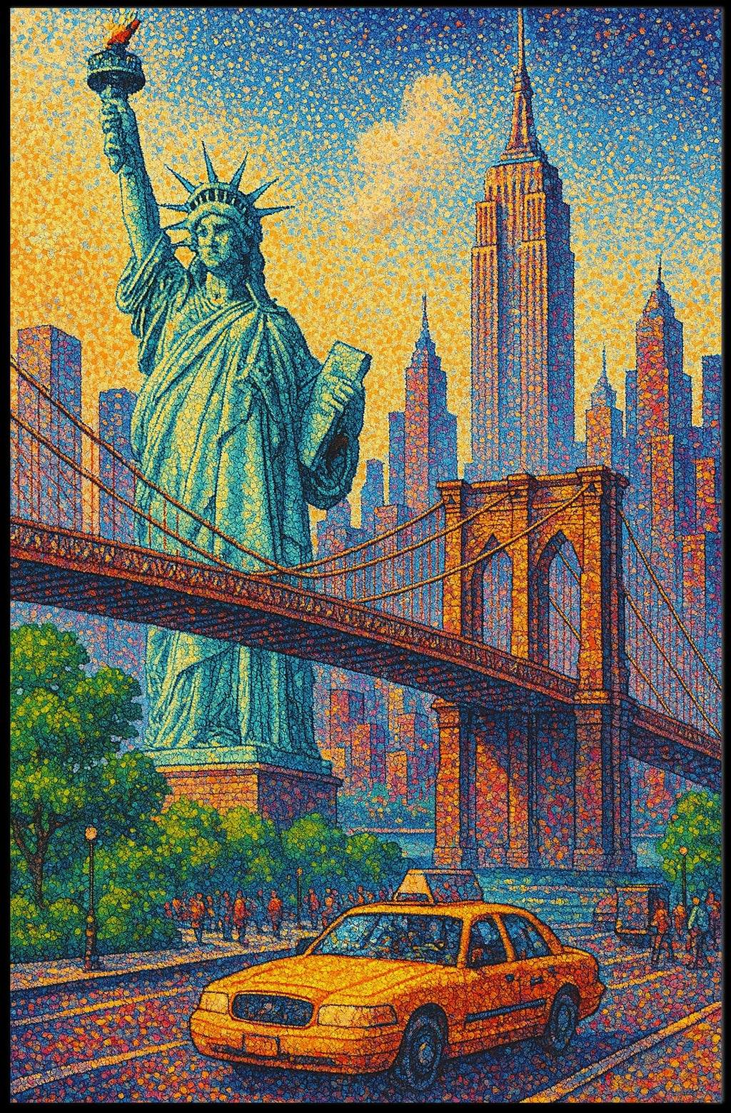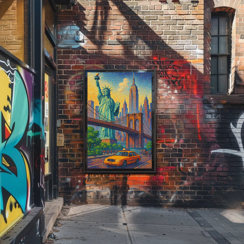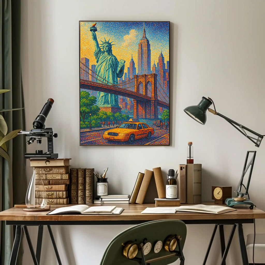 Intro: Immerse yourself in the electric energy of New York City with this Pointillist Landmarks Art Poster. This vibrant artwork blends world-famous icons—the Statue of Liberty, Brooklyn Bridge, and the Empire State Building—into a glowing mosaic that celebrates urban life, ambition, and culture. Perfect for fans of city scenery, tourism art, and colorful wall decor, it brings a dynamic NYC skyline into any room and sparks conversation with every glance.