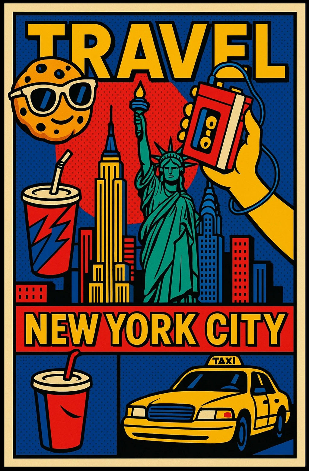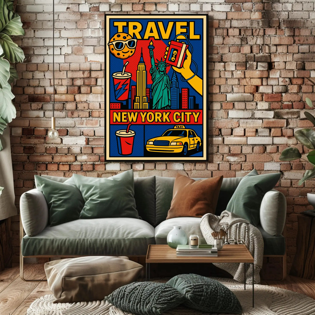 Bring the energy of the Big Apple to your walls with the New York City Pop Art Travel Poster from PosterGoat. This bold, comic‑book style print celebrates iconic landmarks—the Statue of Liberty, the Empire State Building and a classic yellow taxi—rendered in vibrant reds, blues and yellows that pop in any room. Playful accents like a cassette player, soda cup and smiling cookie add a contemporary, nostalgic twist that captures NYC’s lively streets and cultural flair.